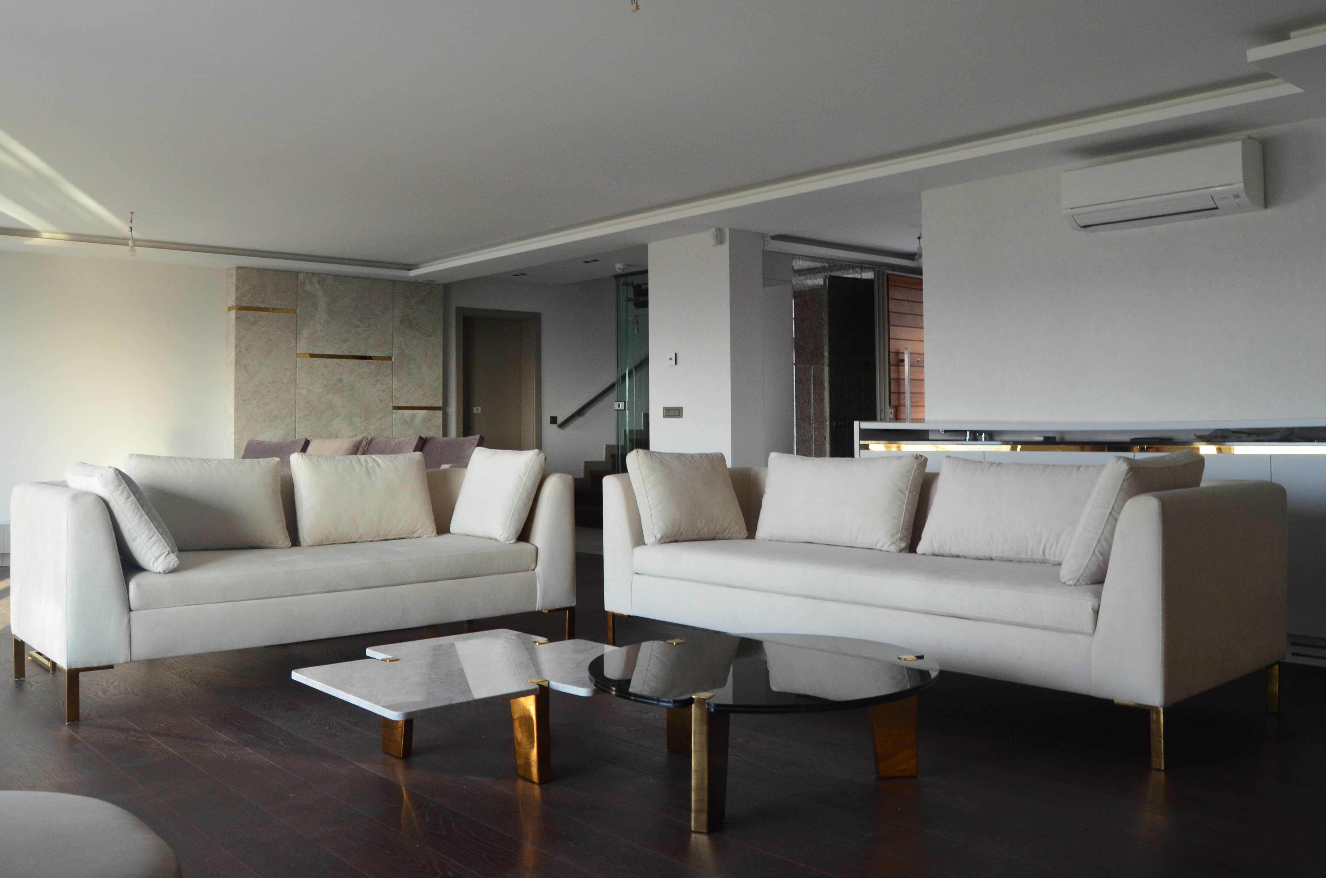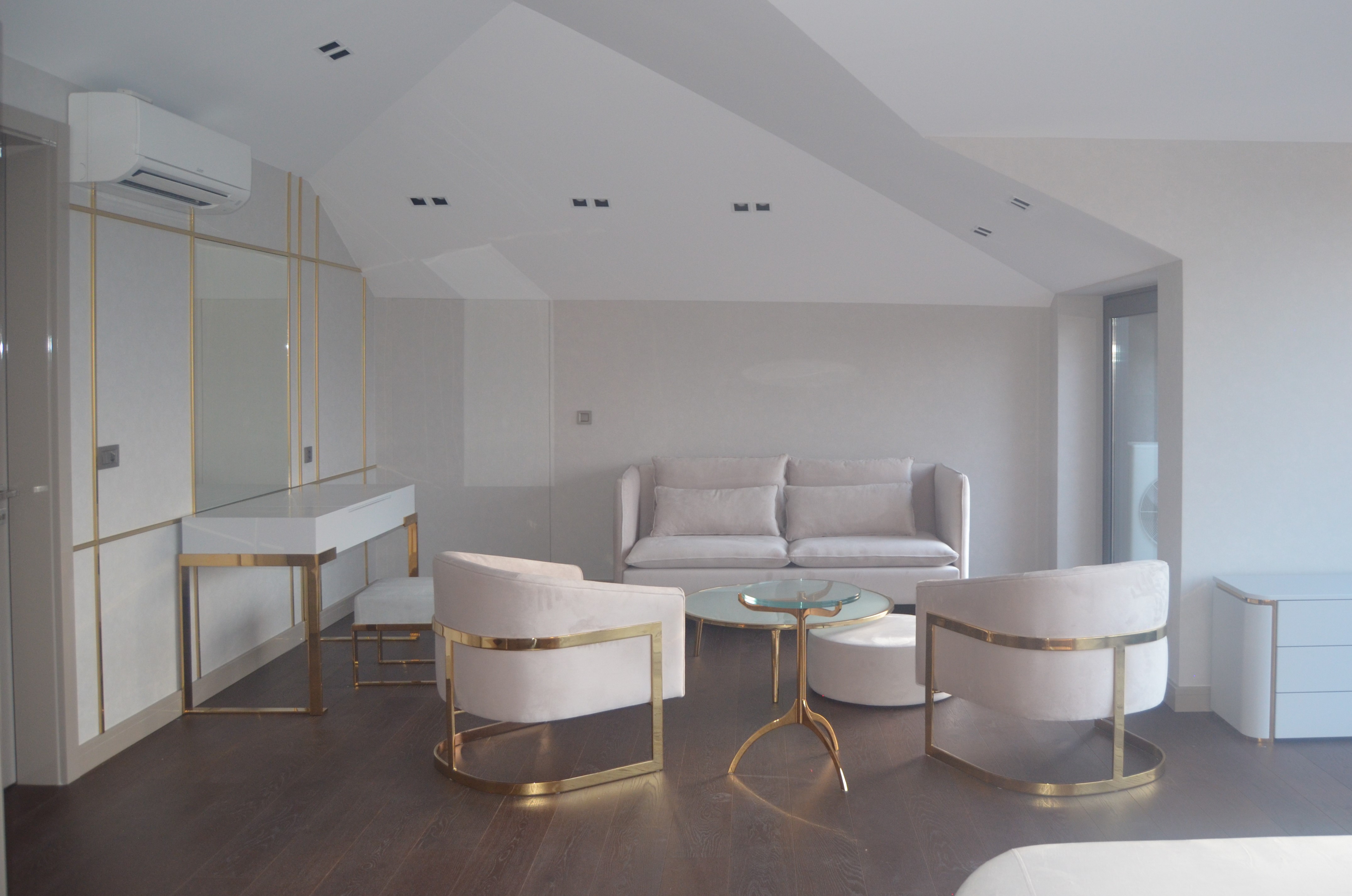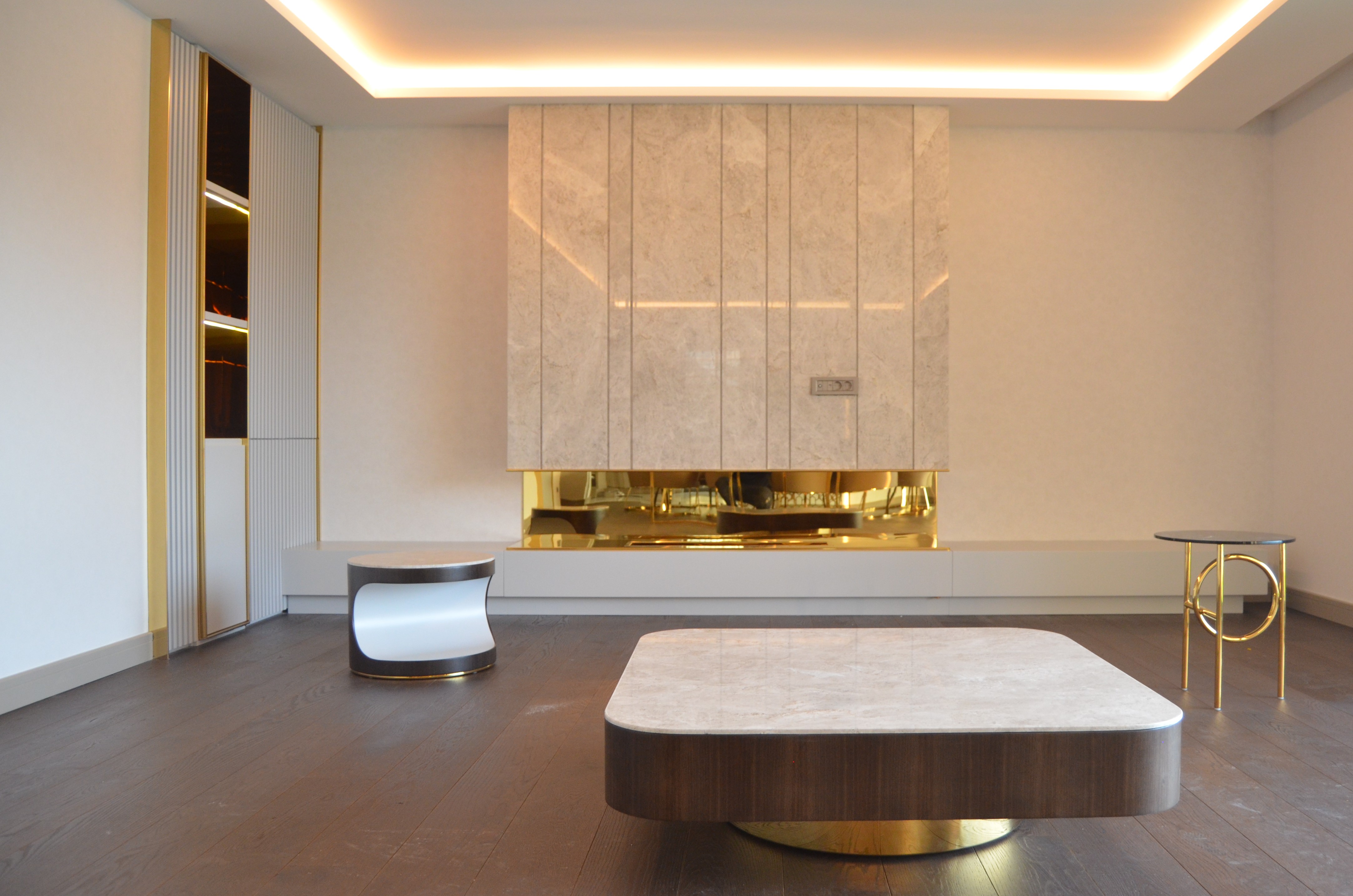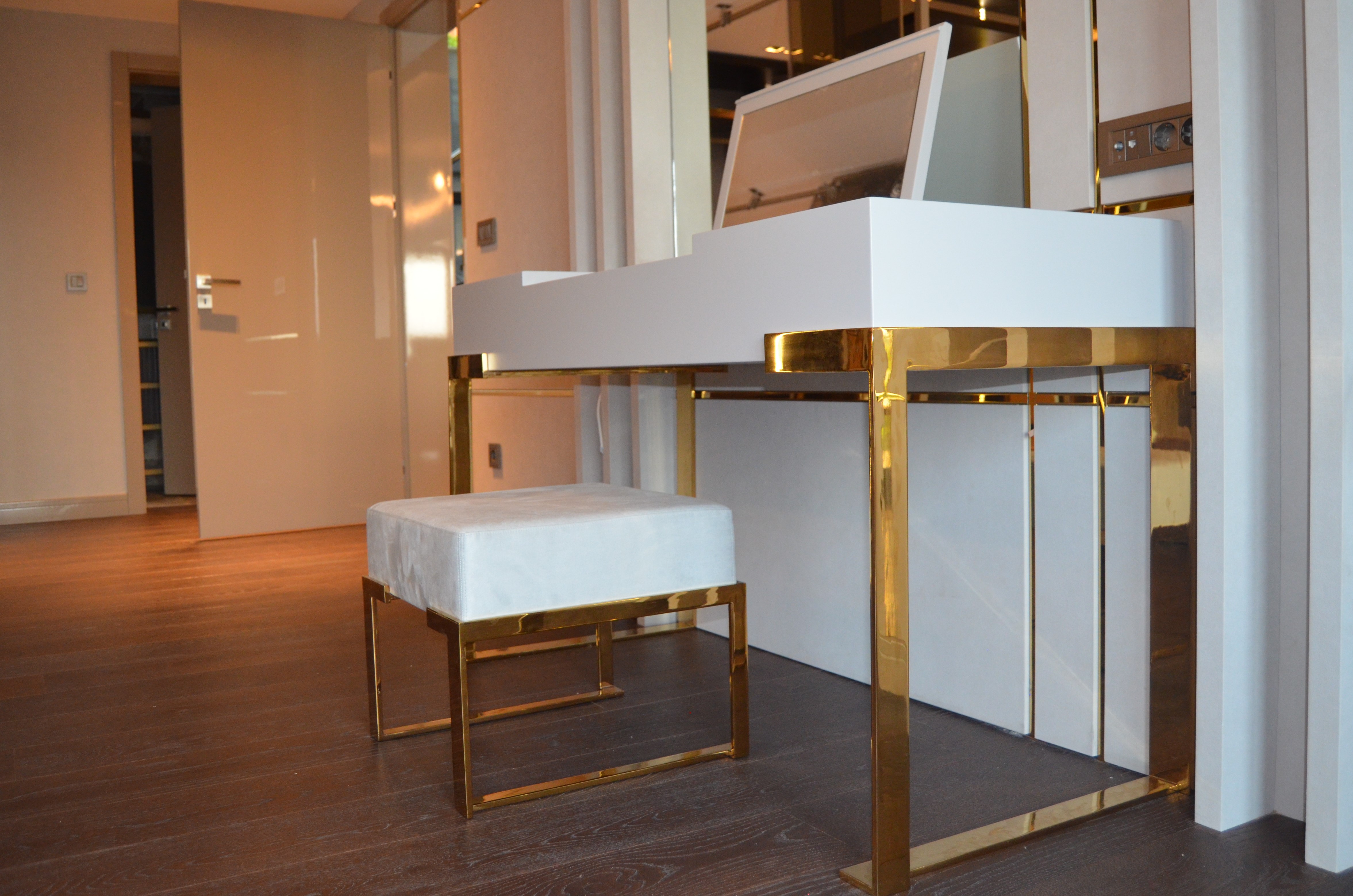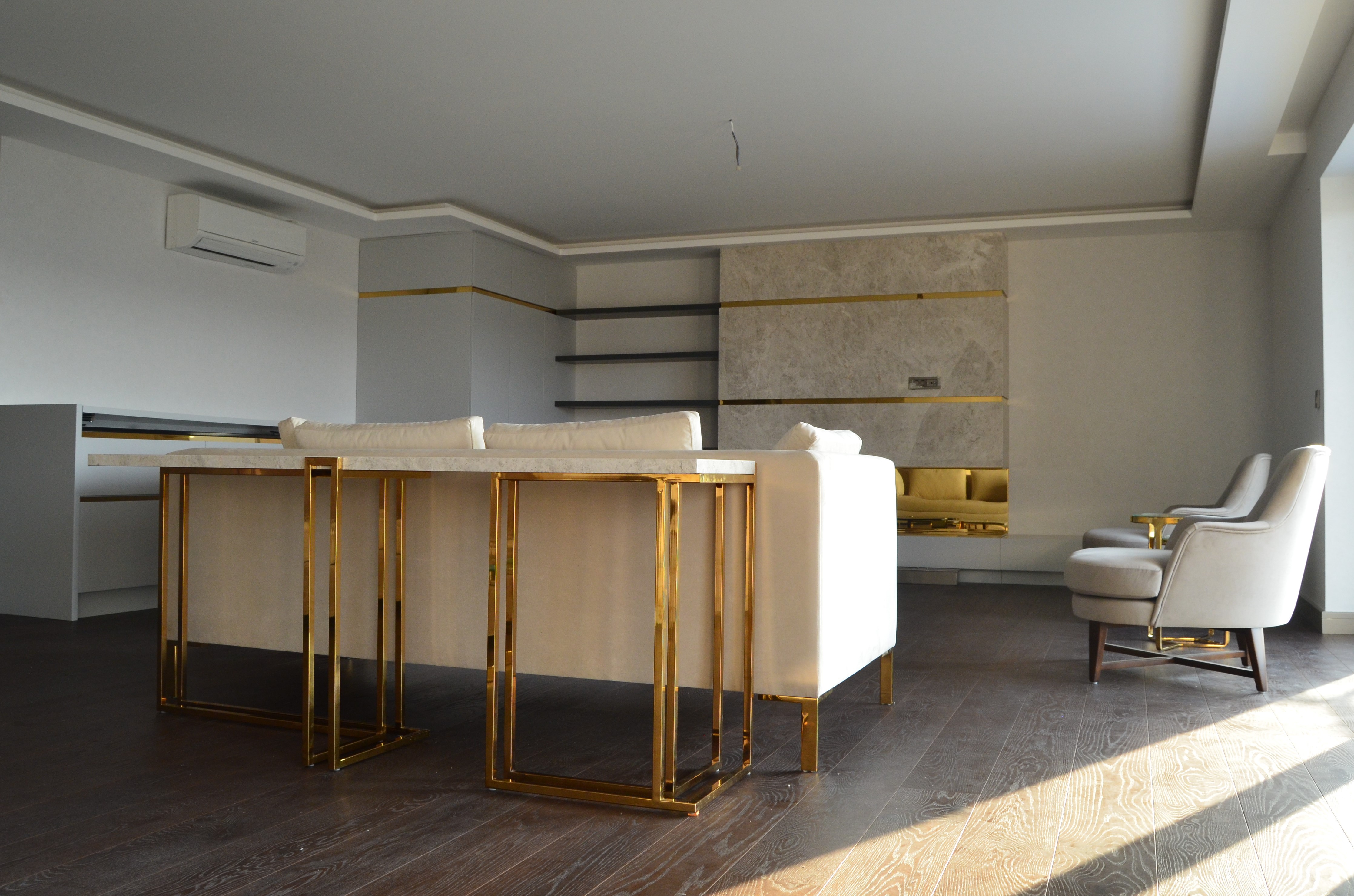 It is a house project completed with metal details combined with furniture and upholstered products, as well as fixed and movable products designed with gold PVD coating on stainless steel.