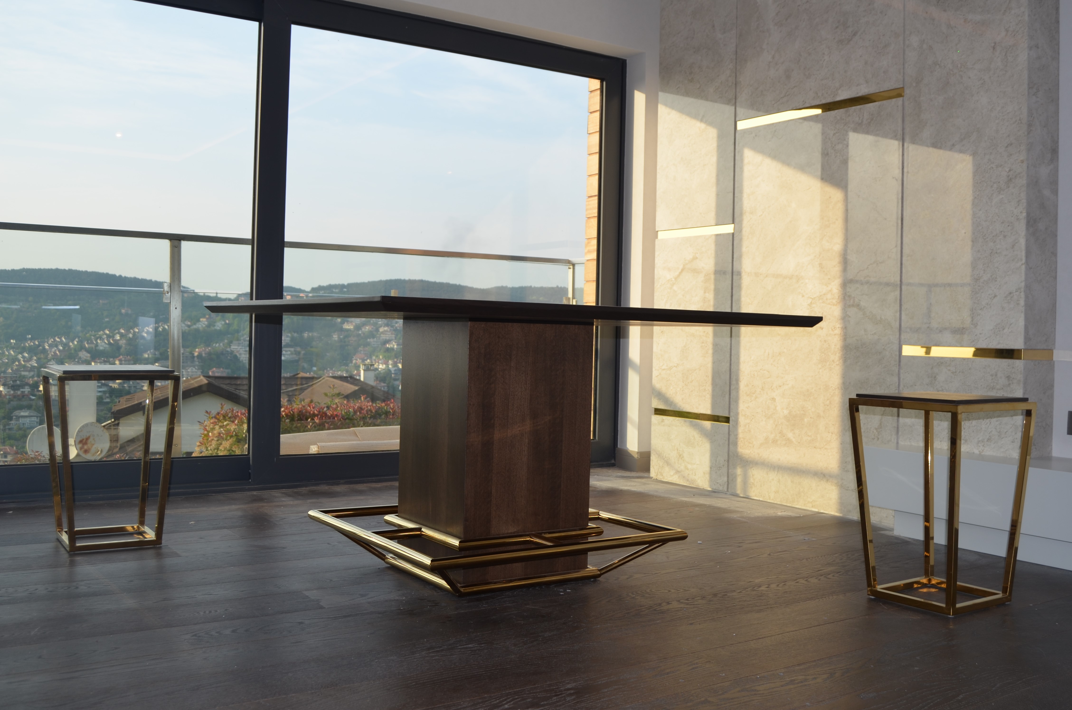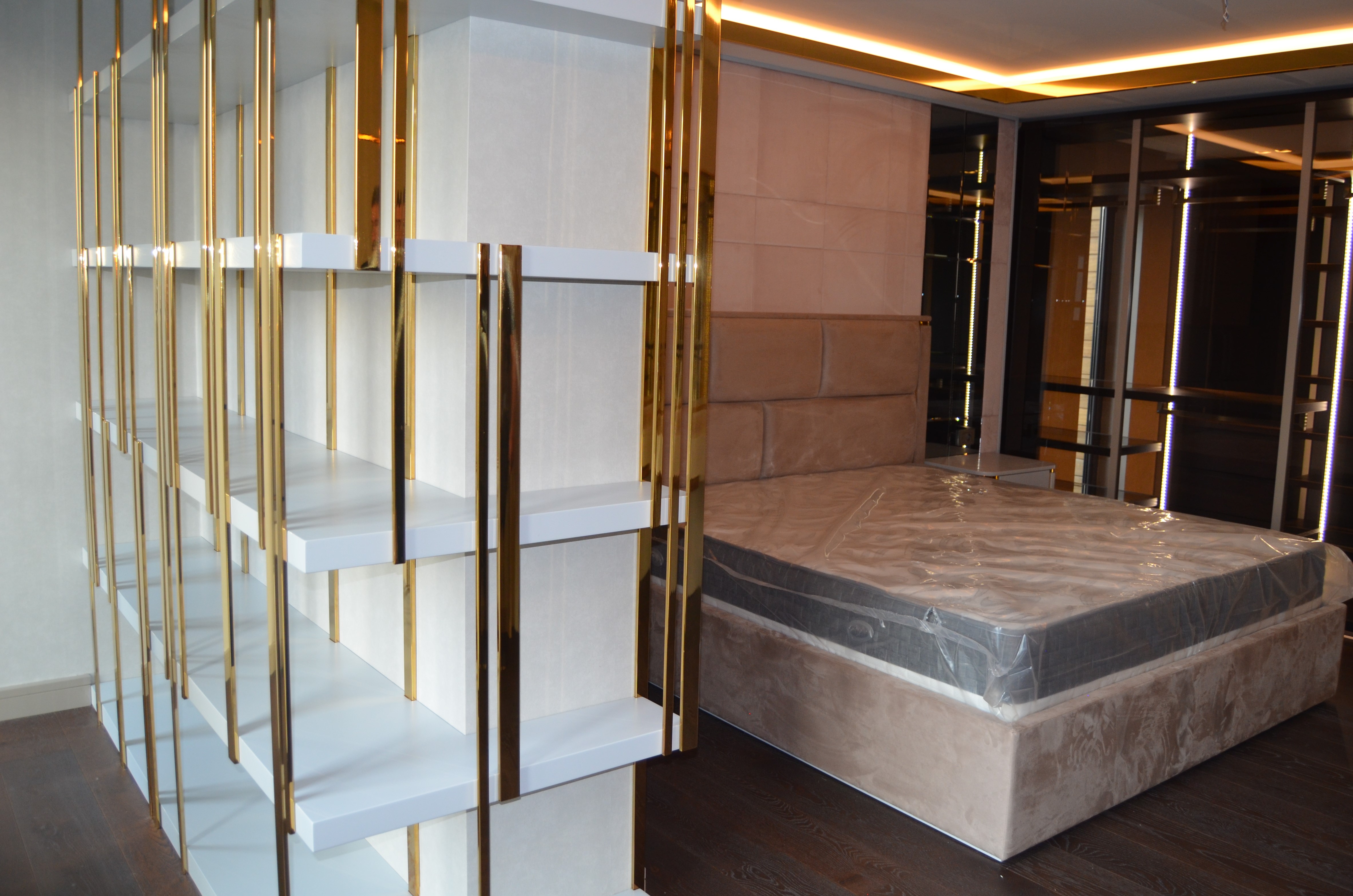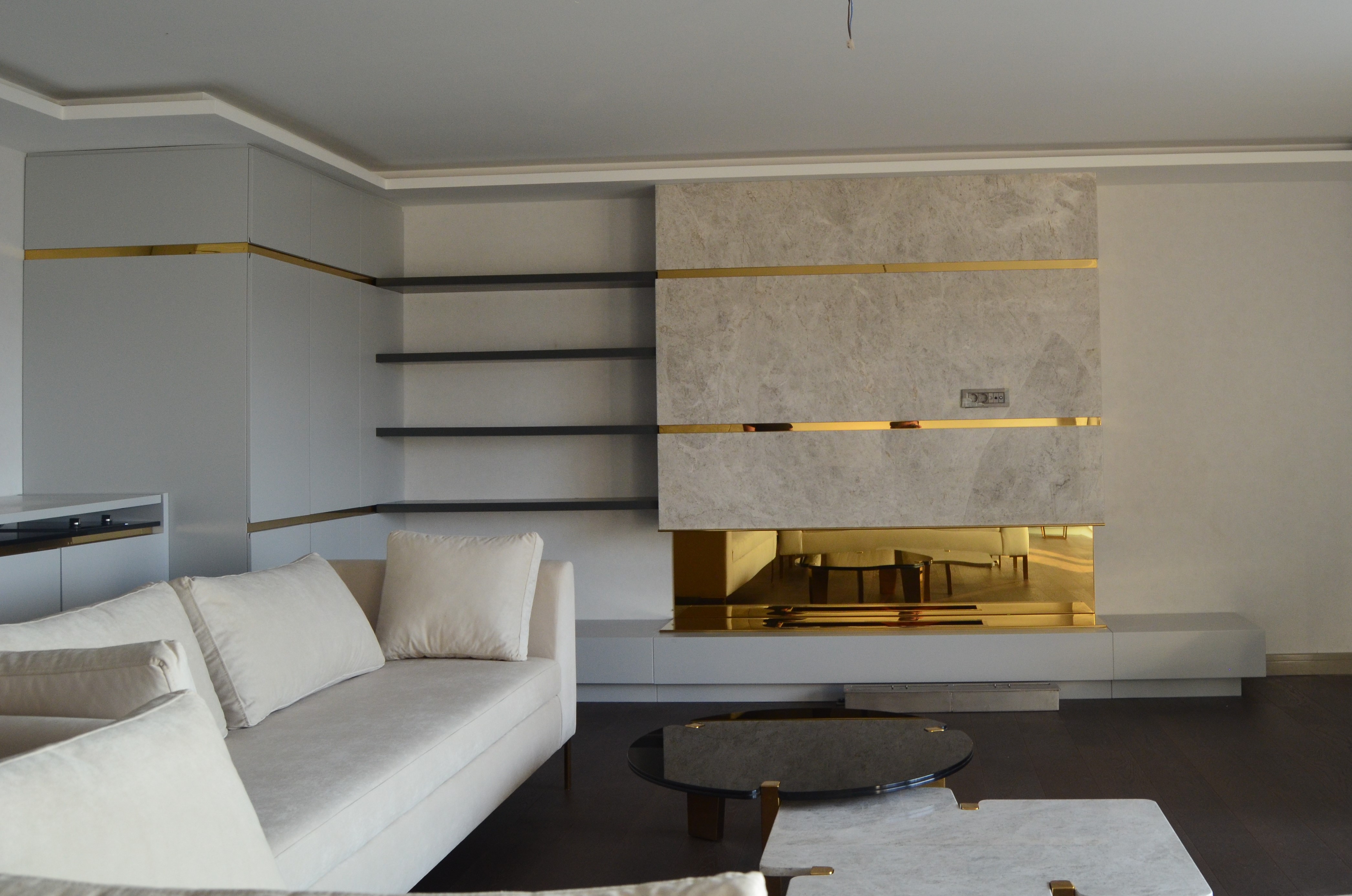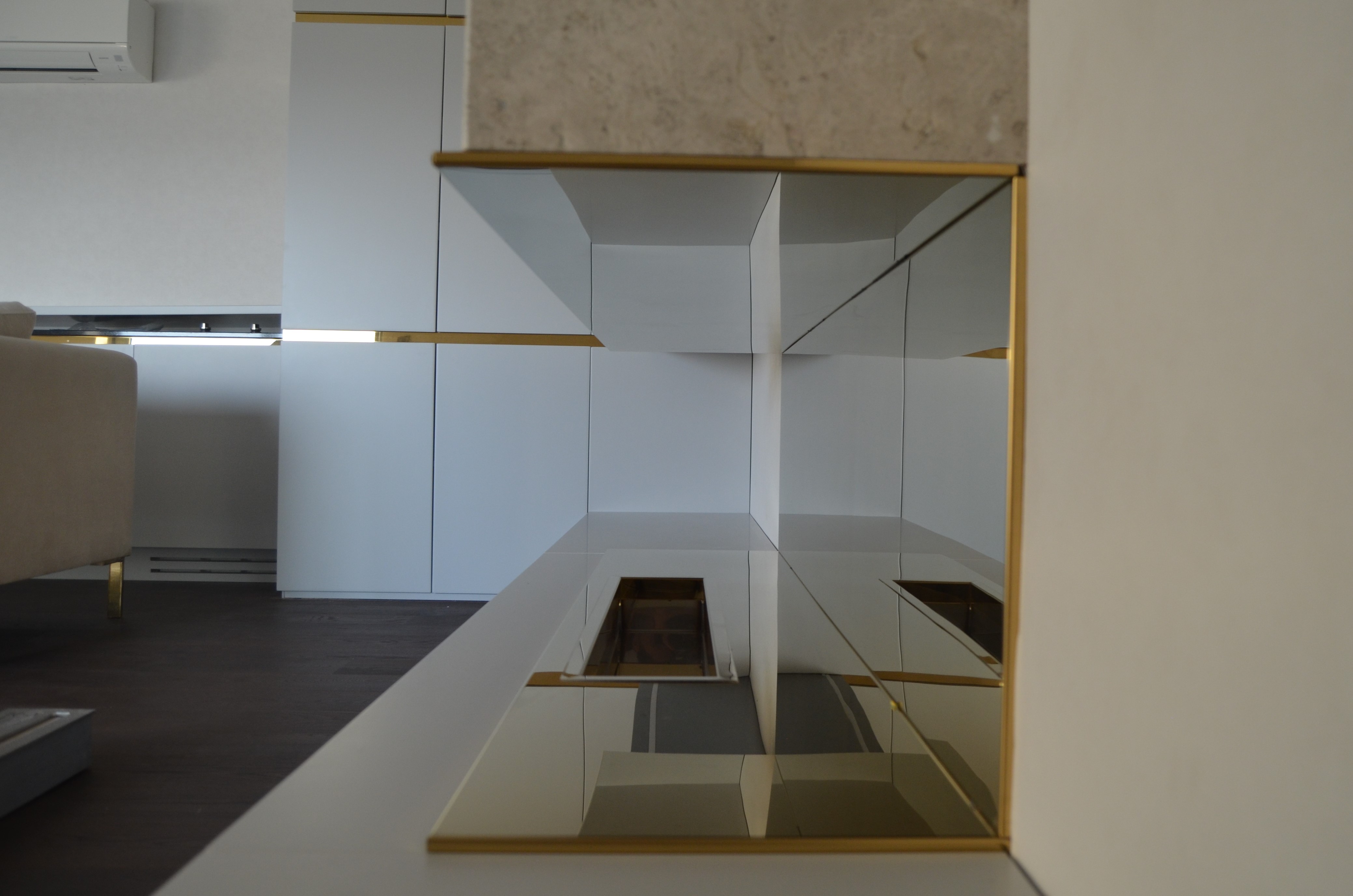 It is a house project completed with metal details combined with furniture and upholstered products, as well as fixed and movable products designed with gold PVD coating on stainless steel.