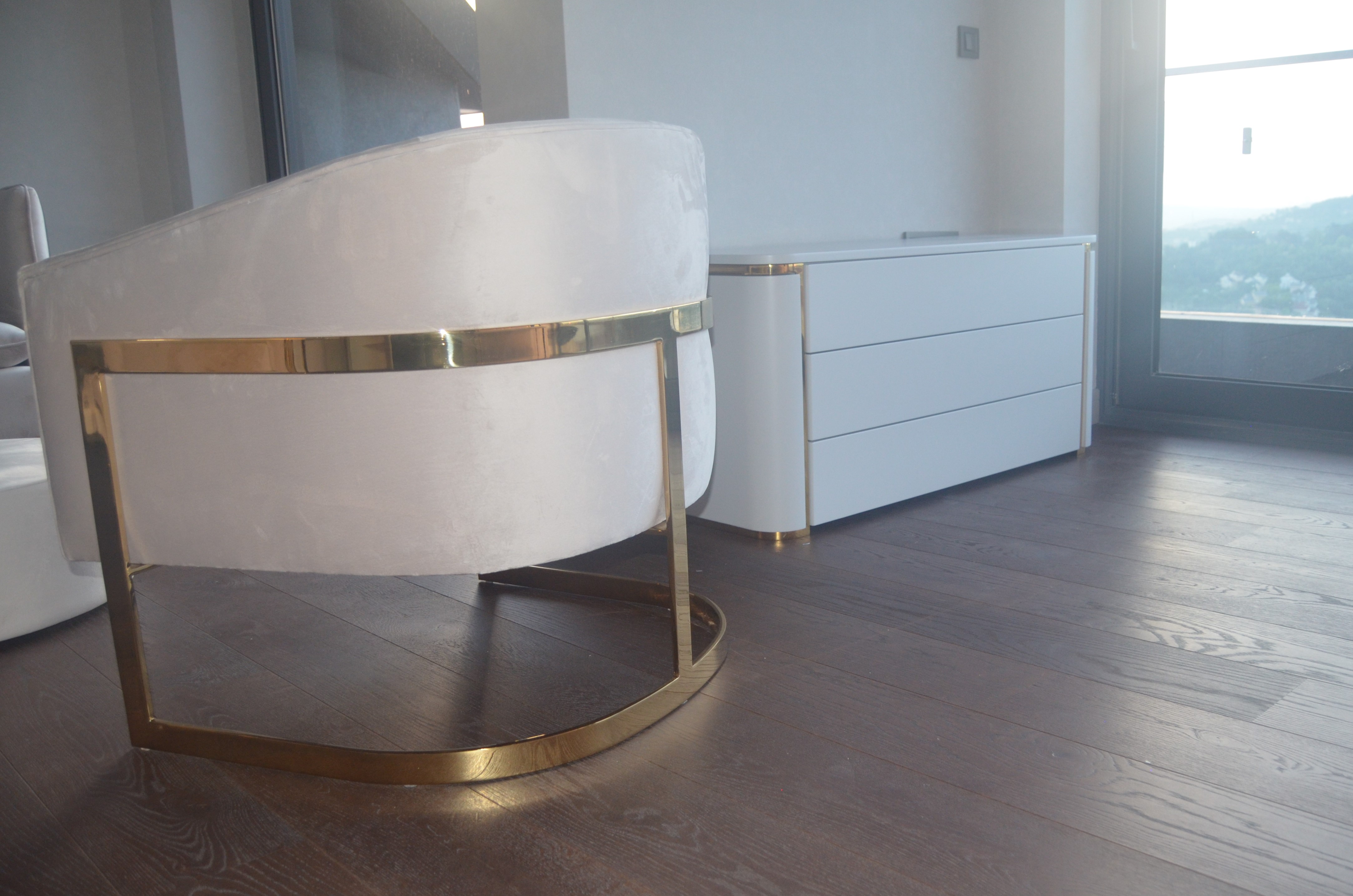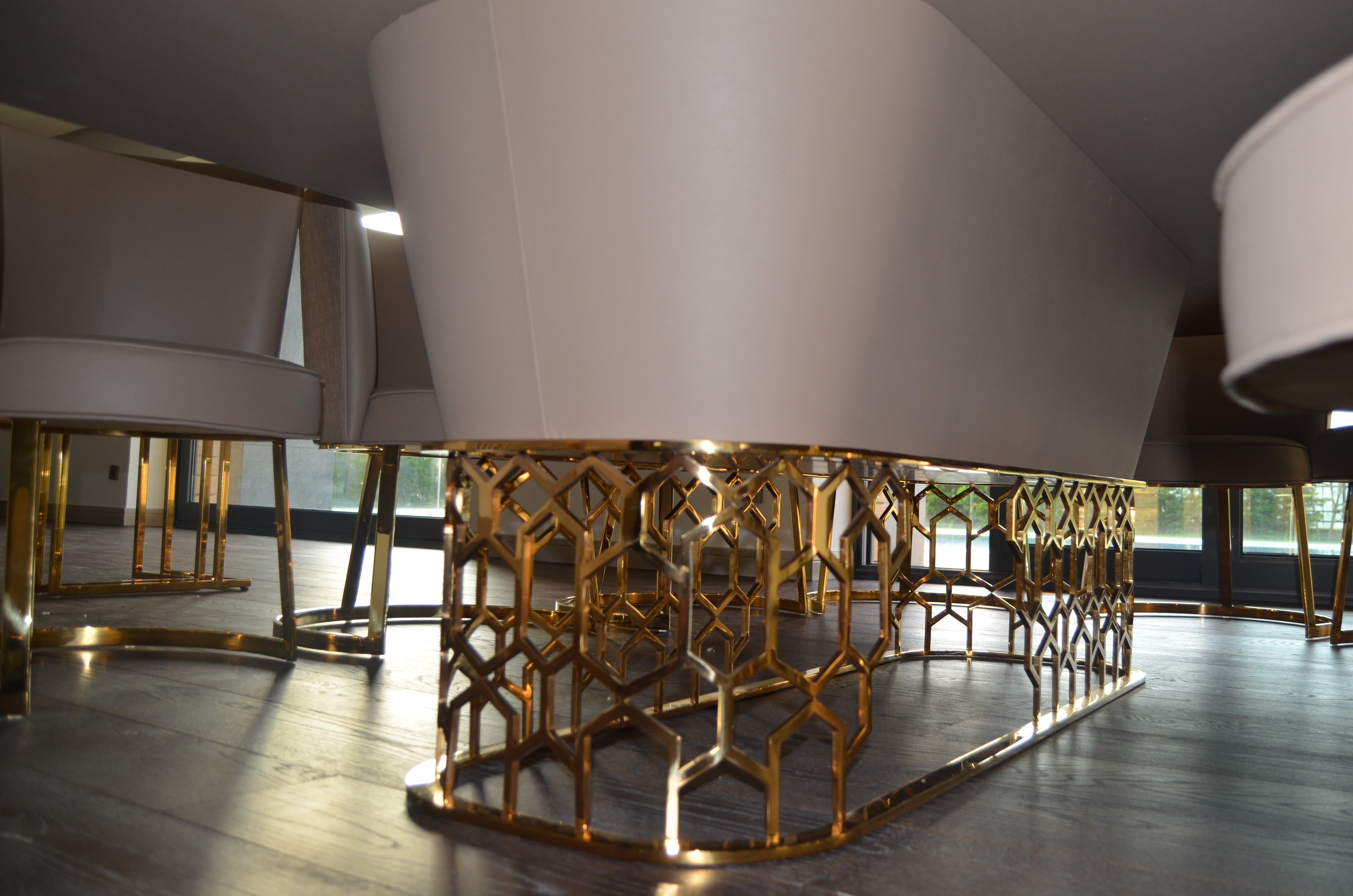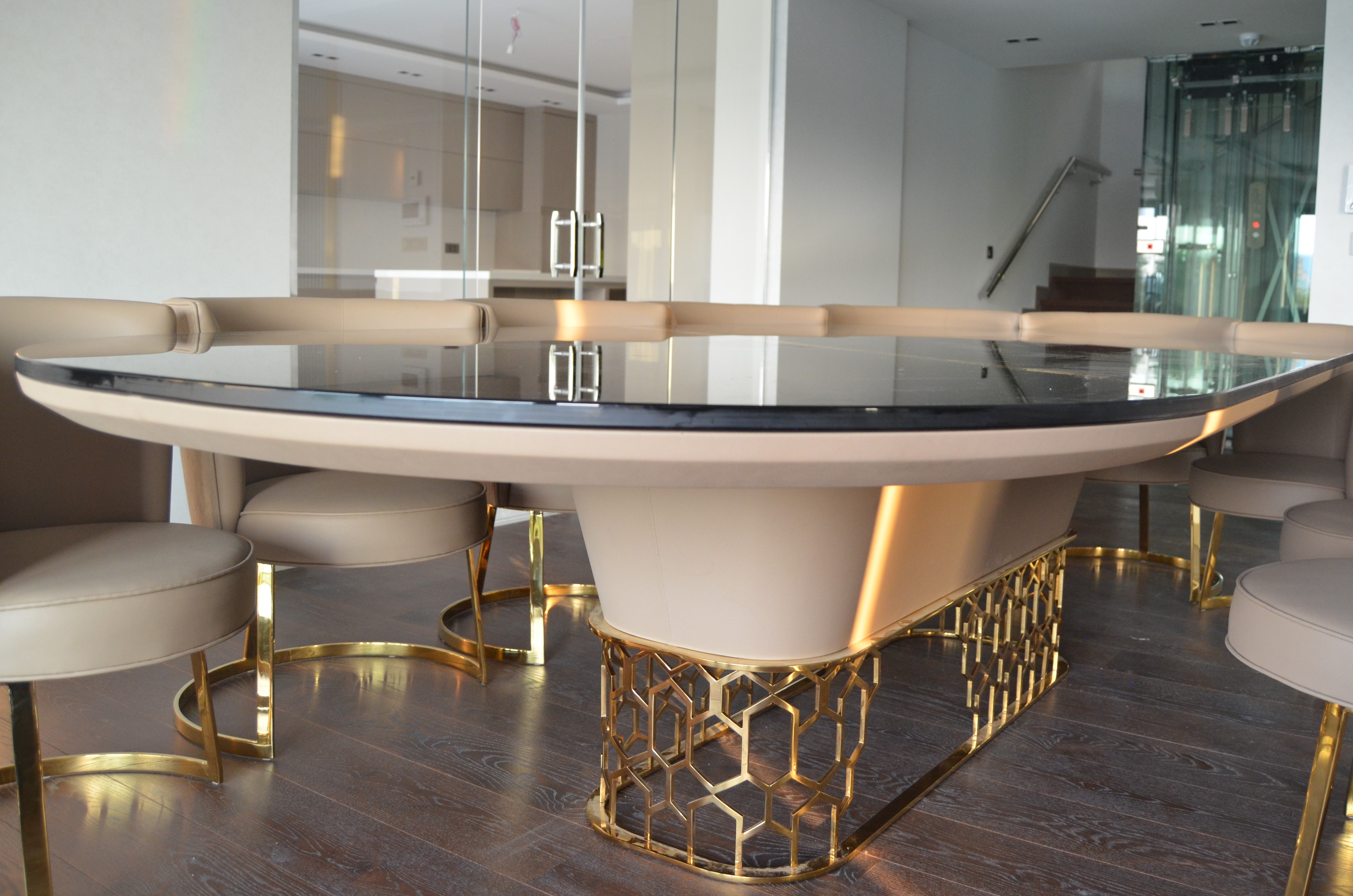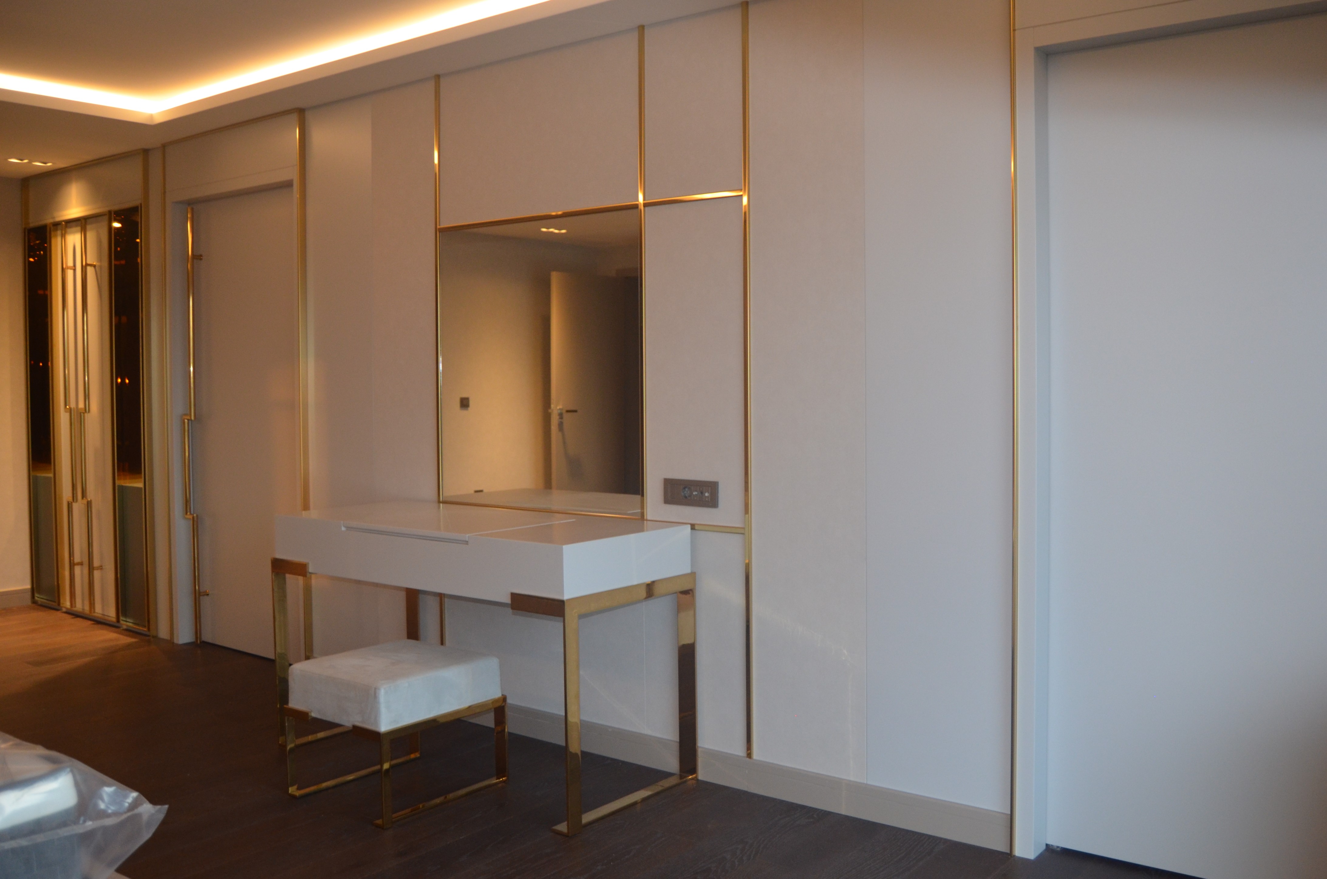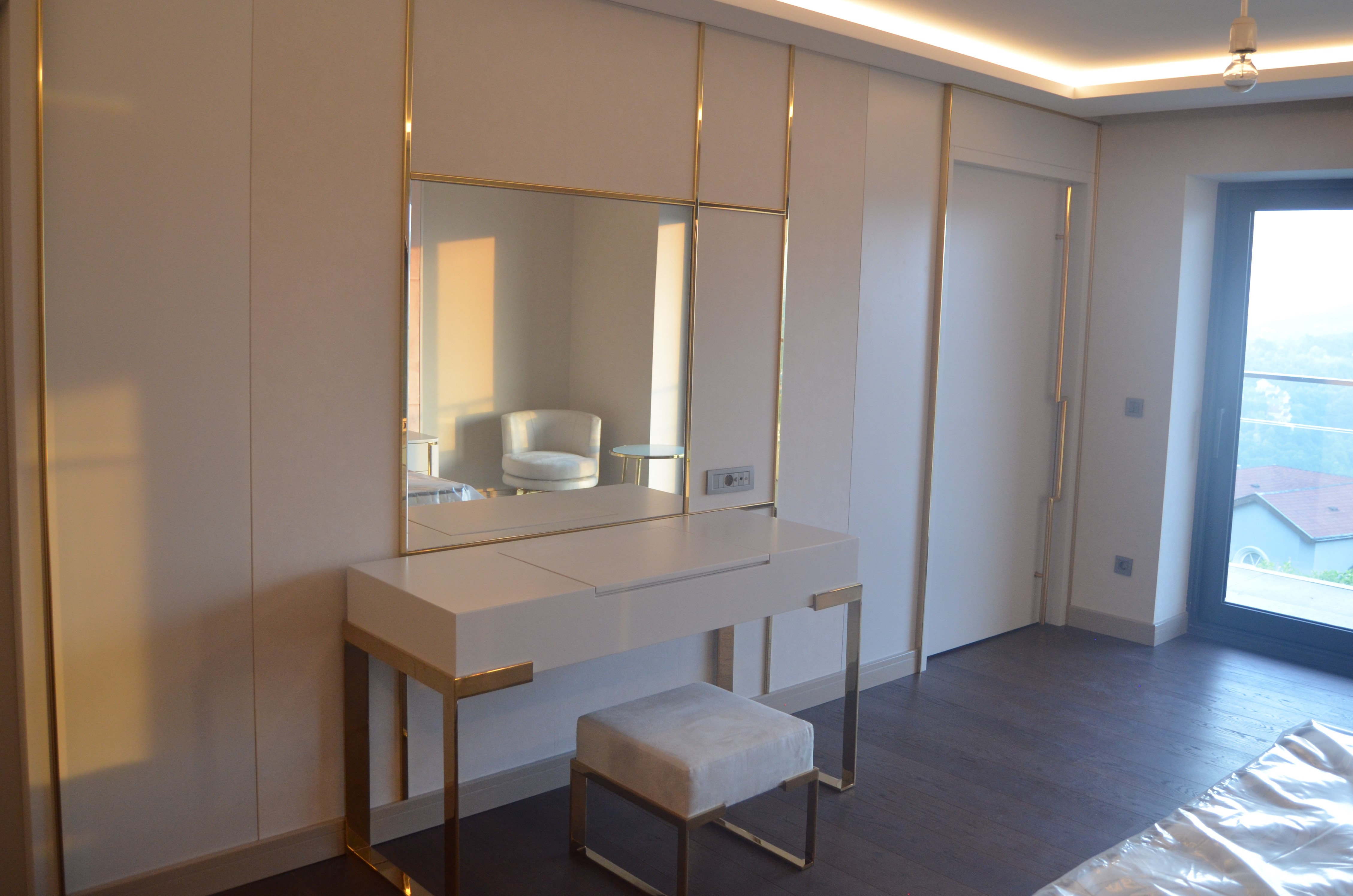 It is a house project completed with metal details combined with furniture and upholstered products, as well as fixed and movable products designed with gold PVD coating on stainless steel.