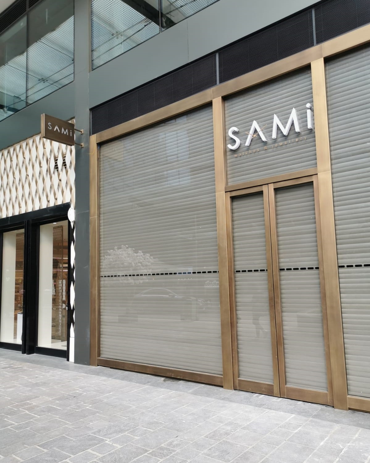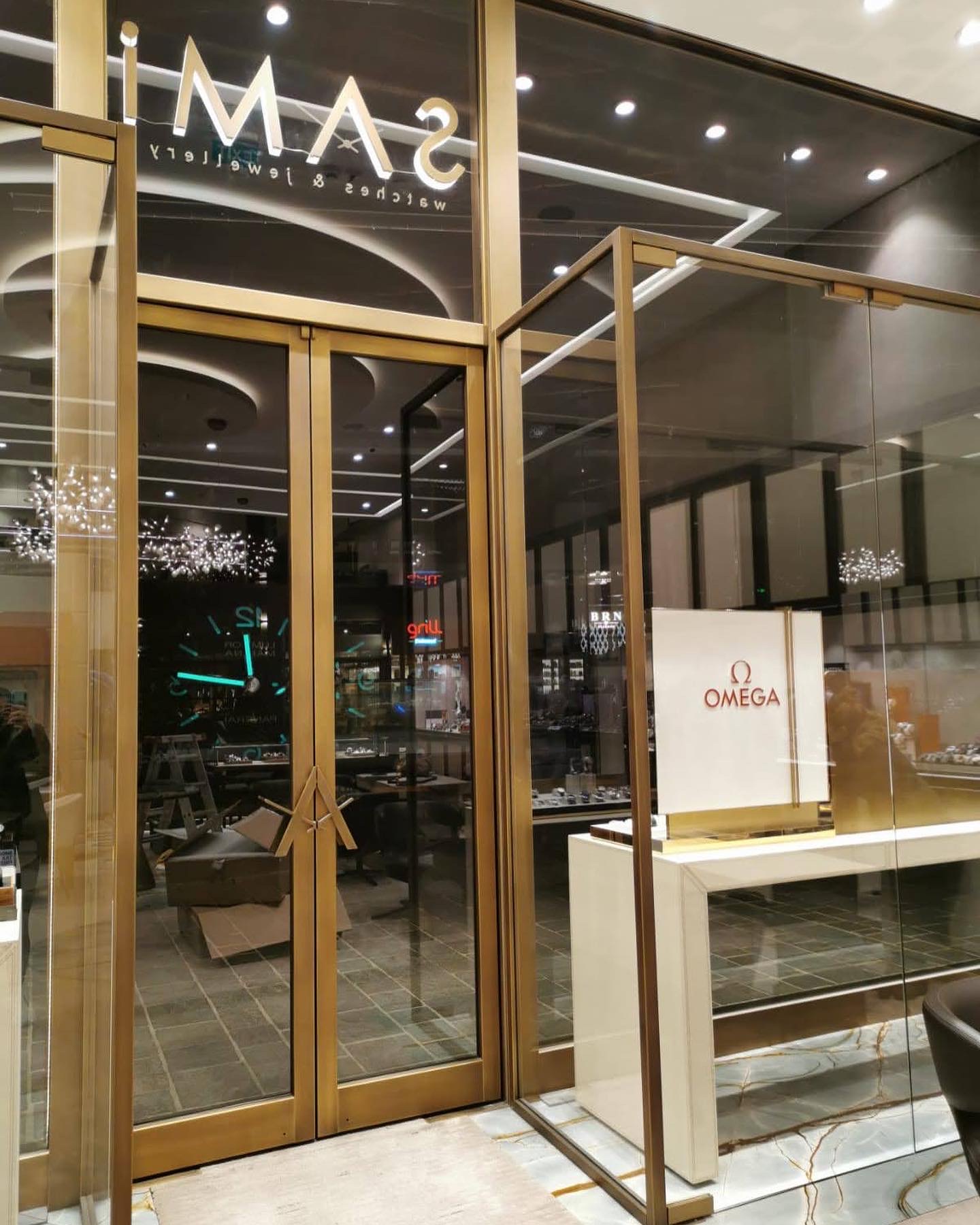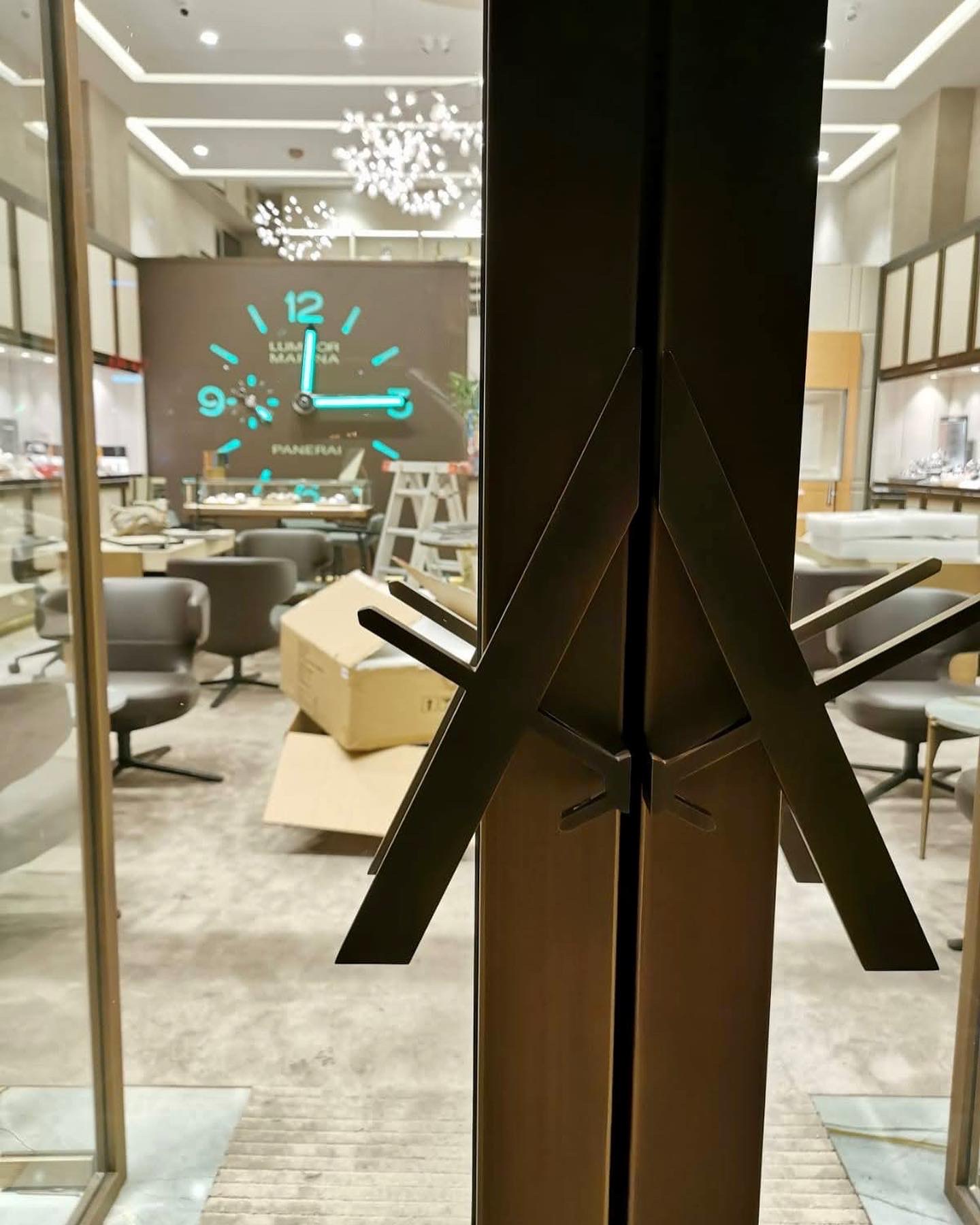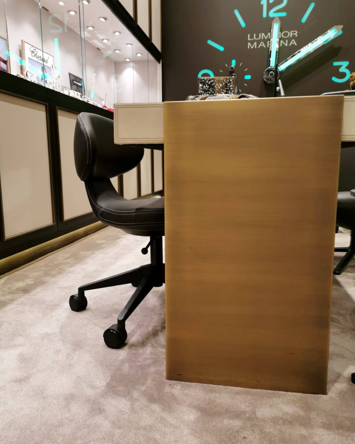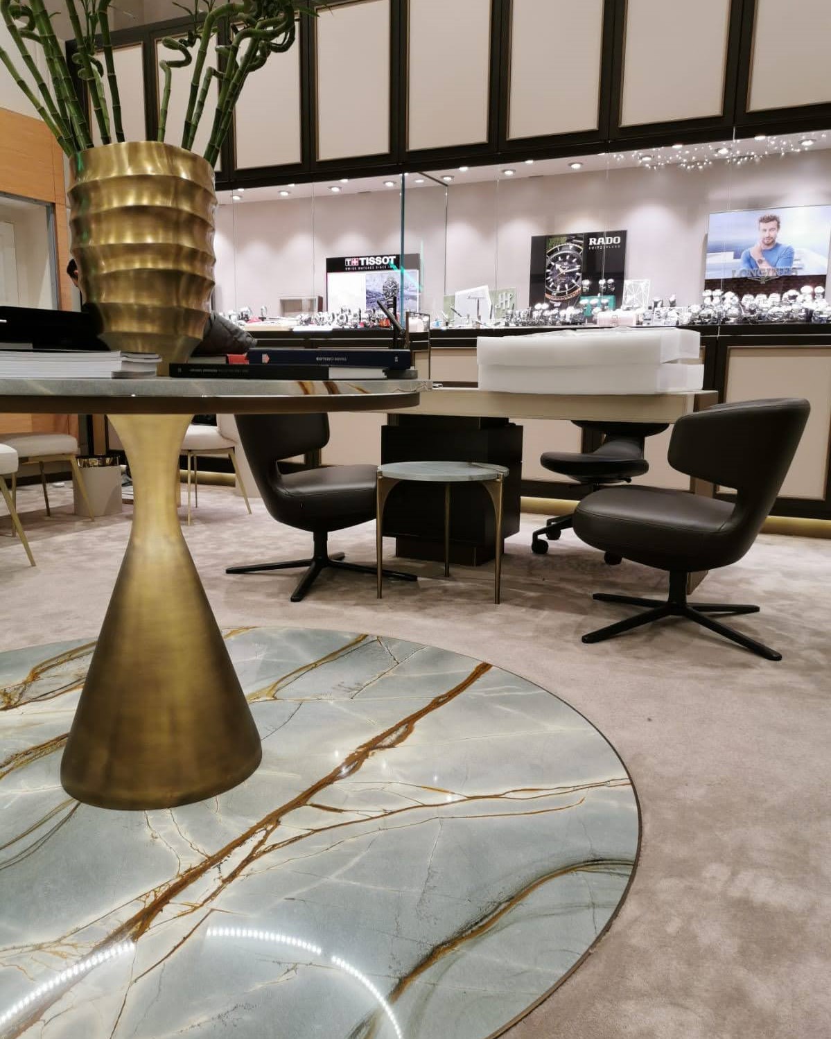 The facade of the store, whose facade covering started with brass tumbled surface joinery, was completed in perfect integrity with consecutive brass tumbled surface cast coffee tables, display units, table top mirrors, cabinet door frames, brand logos, drawer handles, glass display units, and illuminated signs.
