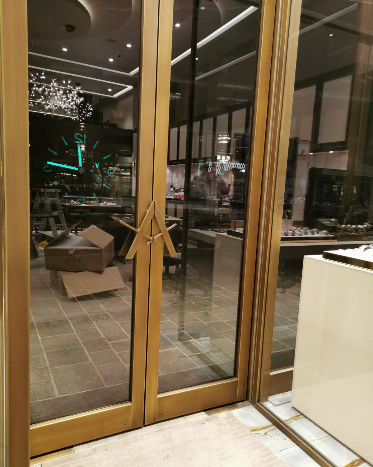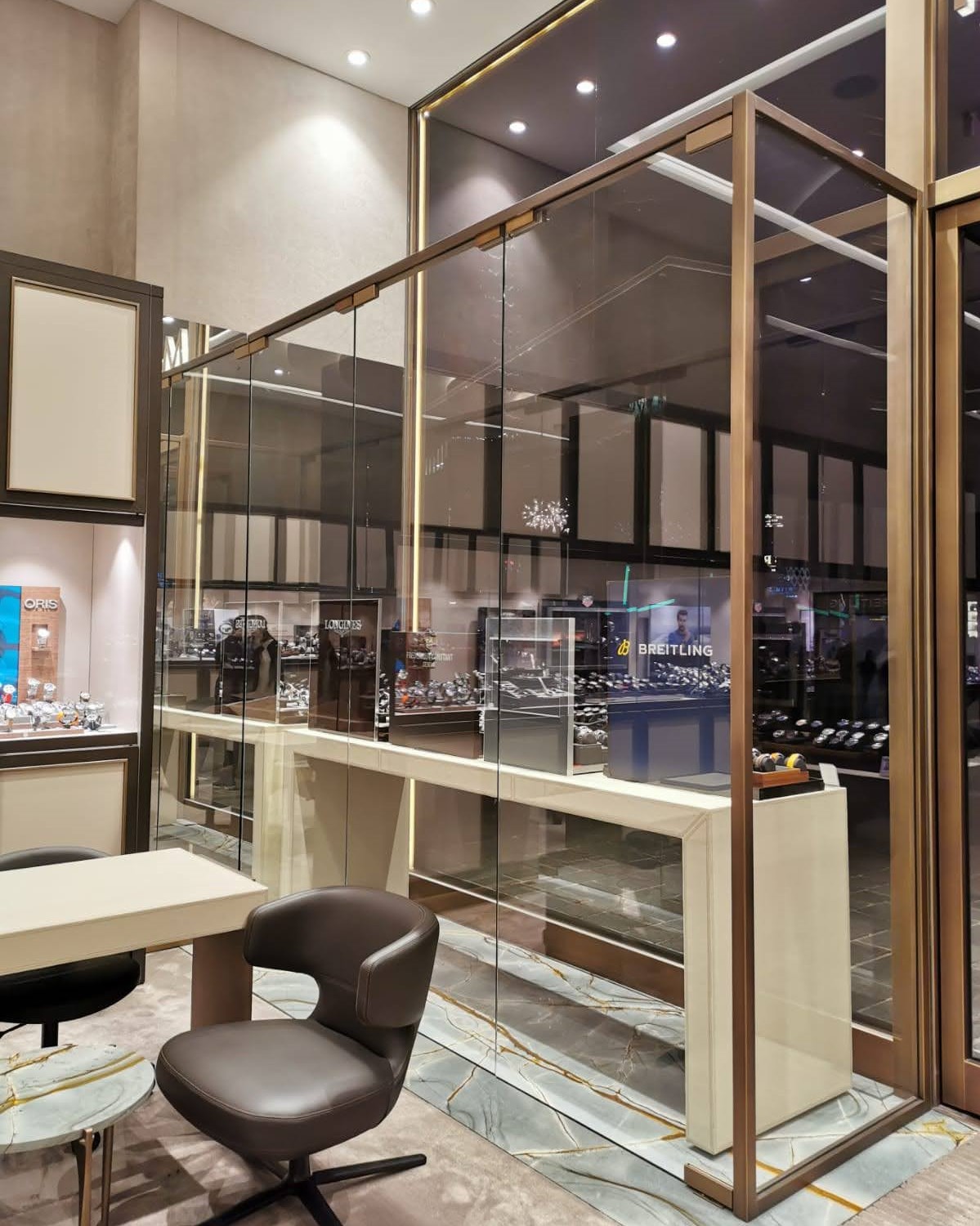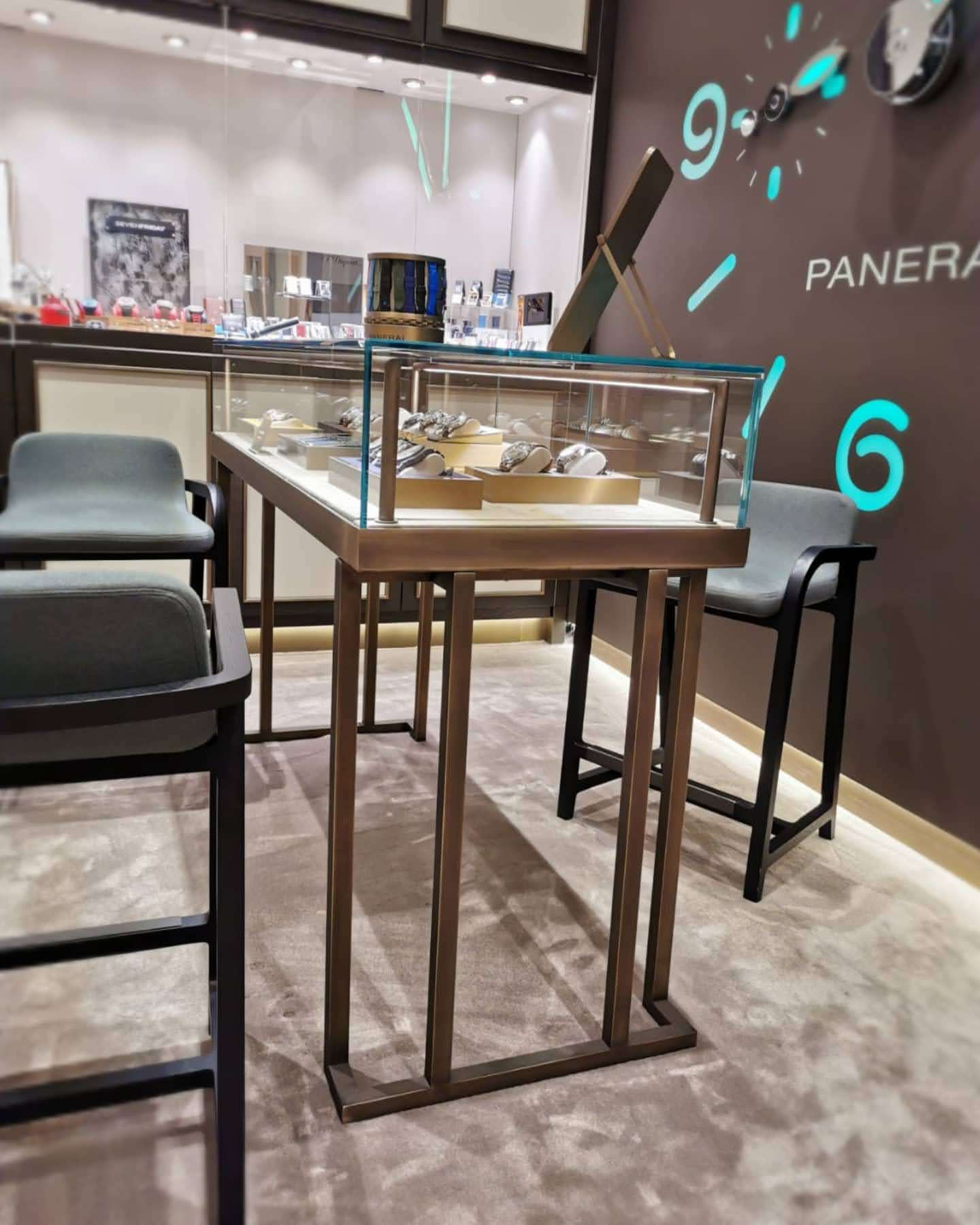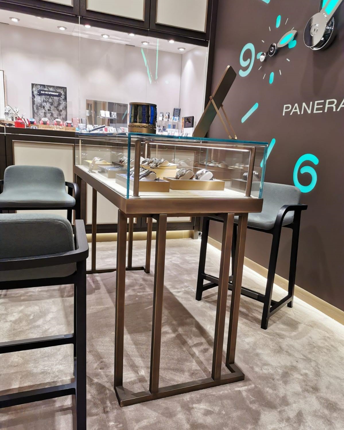 The facade of the store, whose facade covering started with brass tumbled surface joinery, was completed in perfect integrity with consecutive brass tumbled surface cast coffee tables, display units, table top mirrors, cabinet door frames, brand logos, drawer handles, glass display units, and illuminated signs.