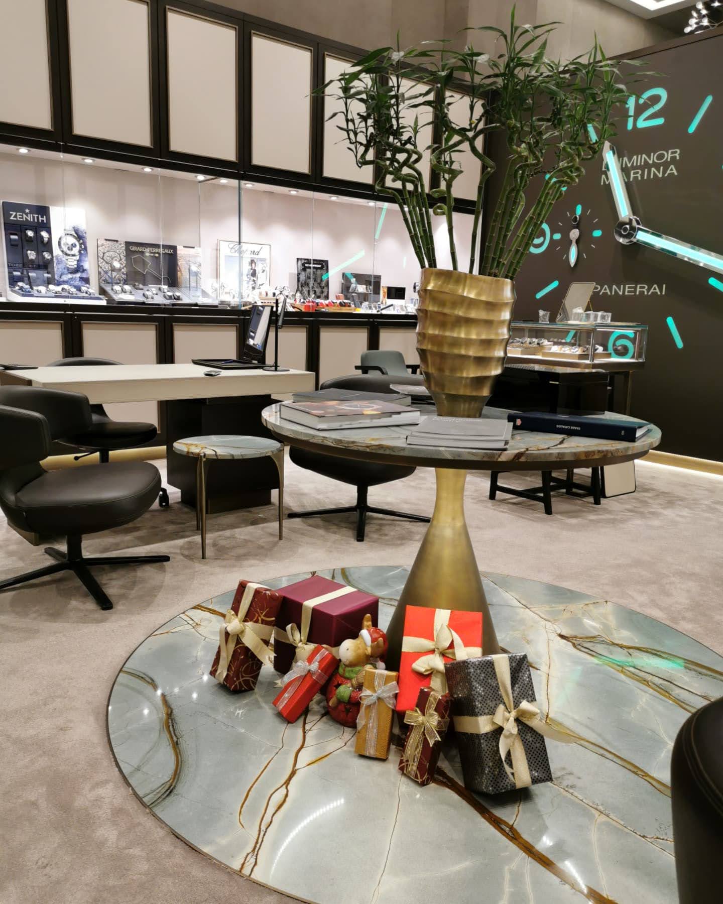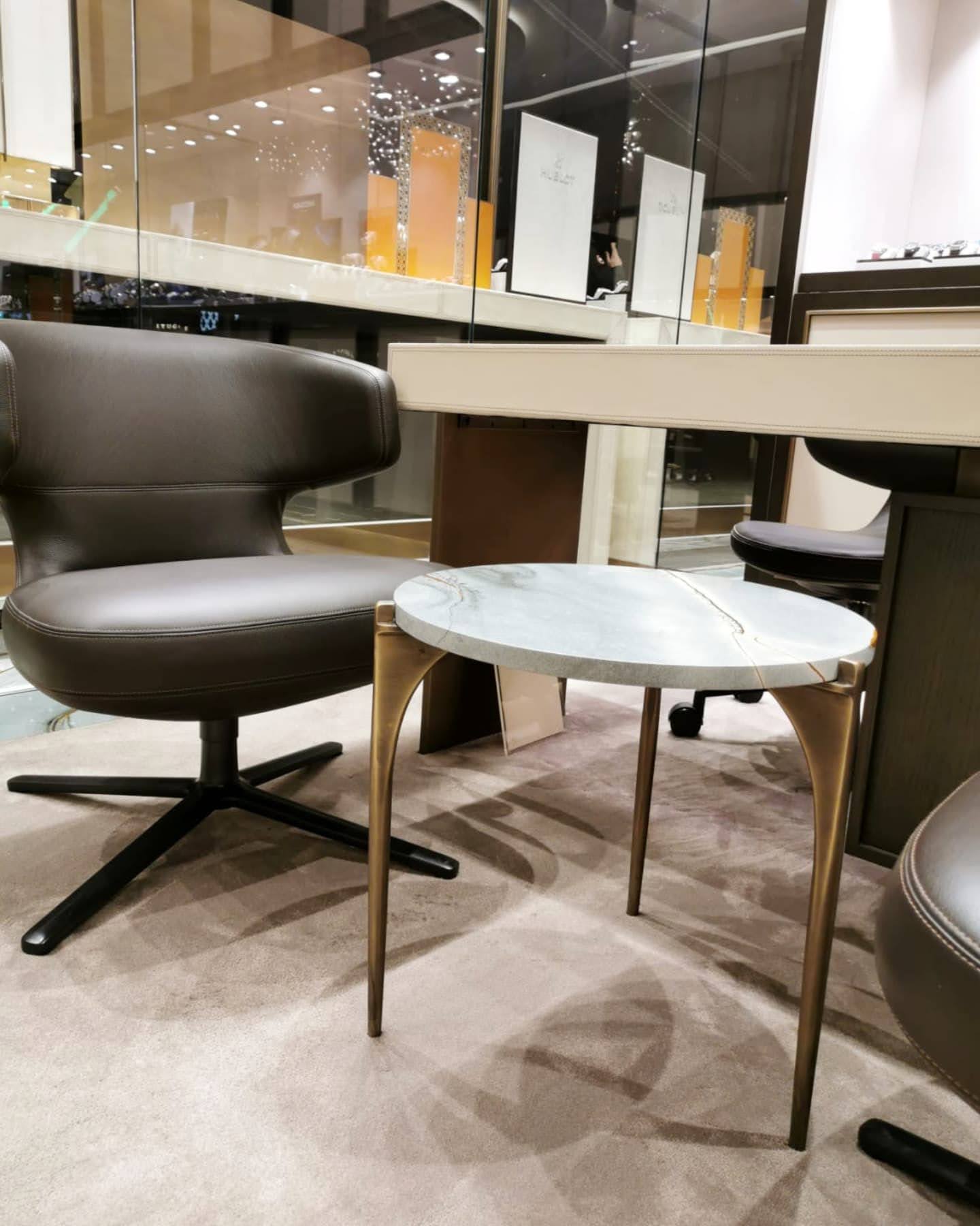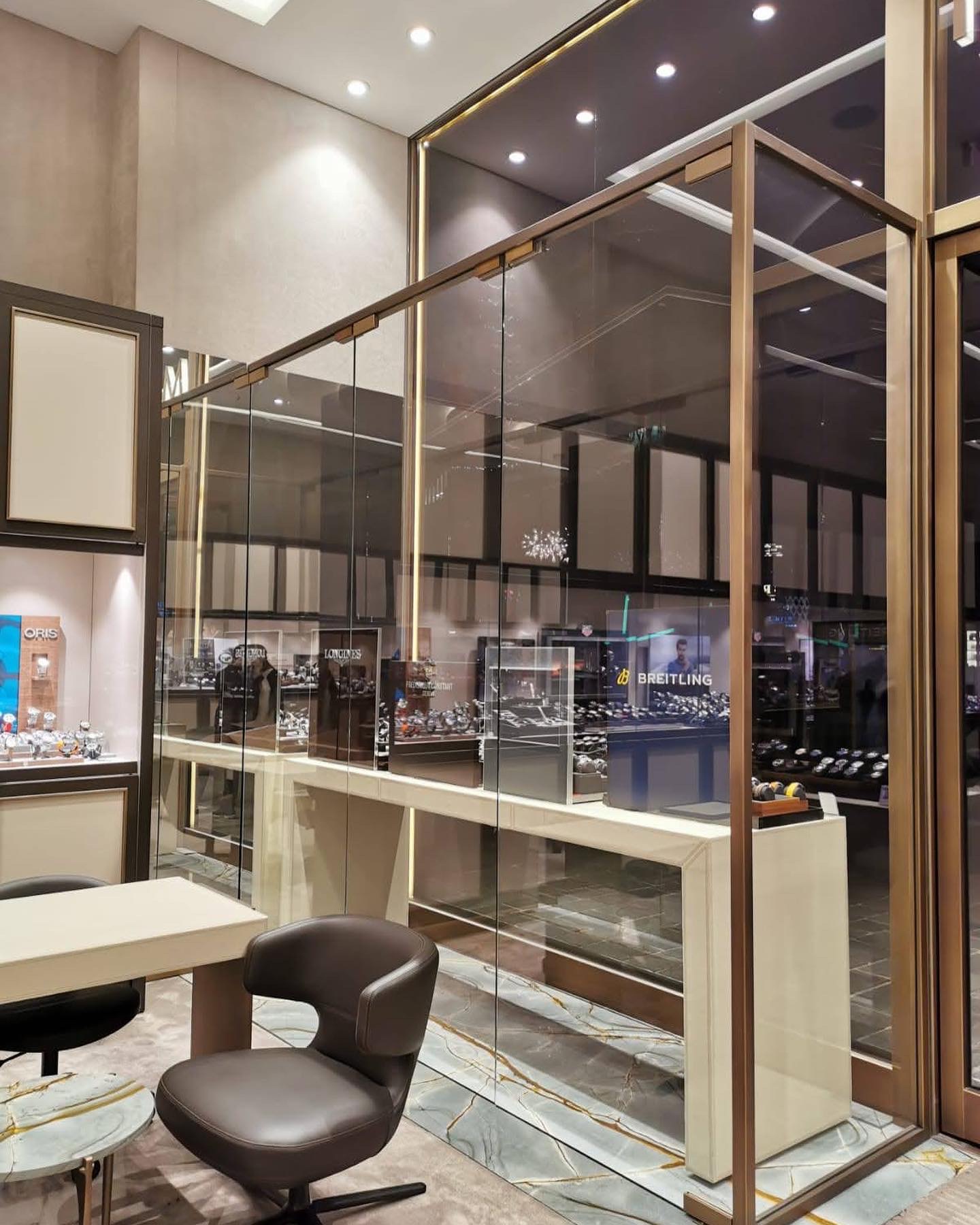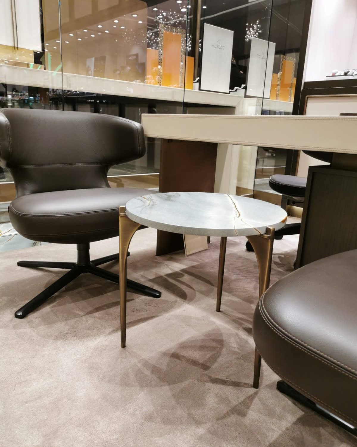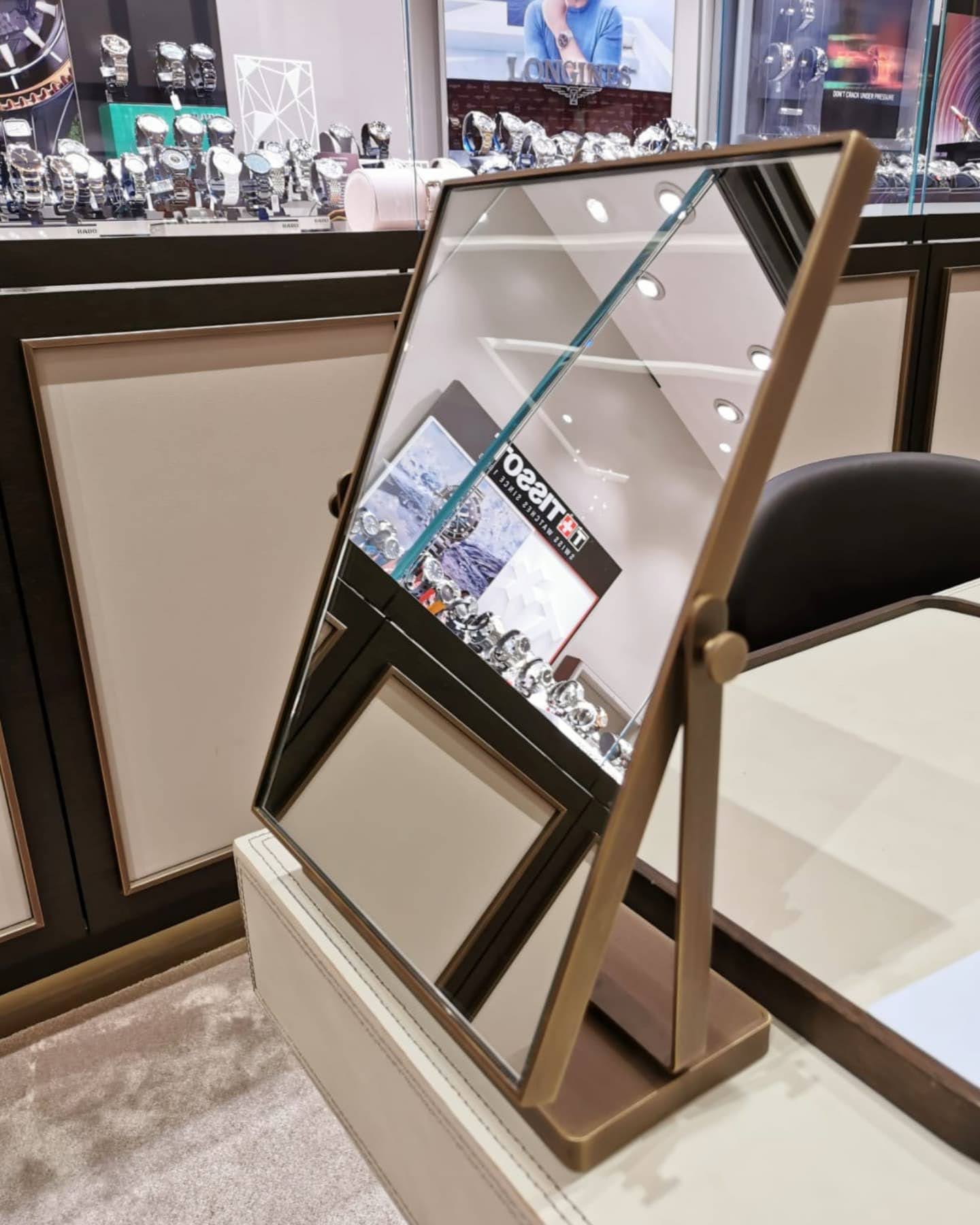 The facade of the store, whose facade covering started with brass tumbled surface joinery, was completed in perfect integrity with consecutive brass tumbled surface cast coffee tables, display units, table top mirrors, cabinet door frames, brand logos, drawer handles, glass display units, and illuminated signs.