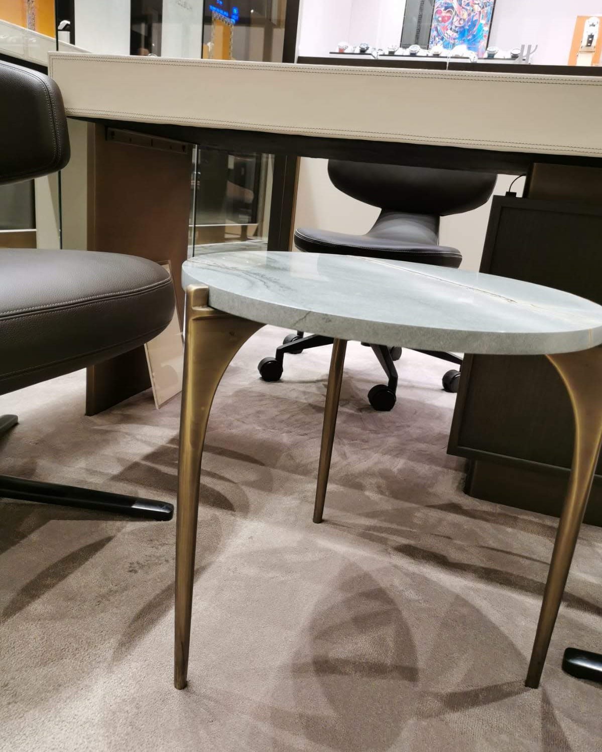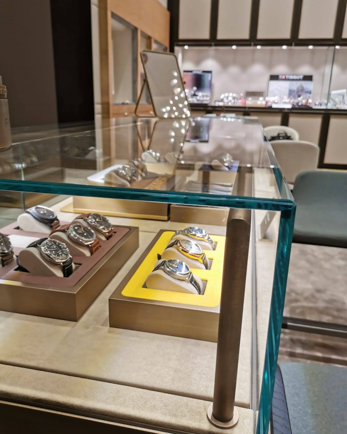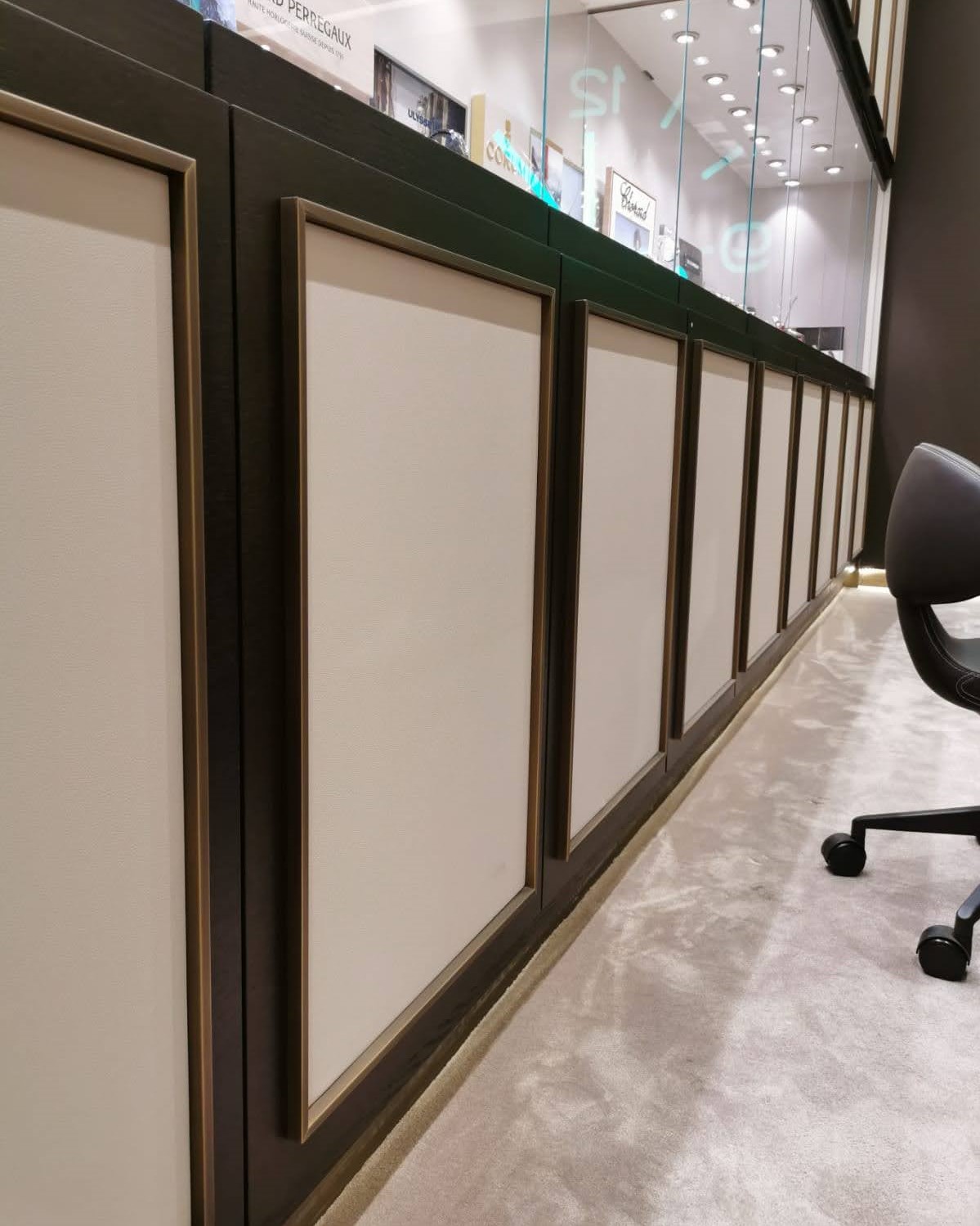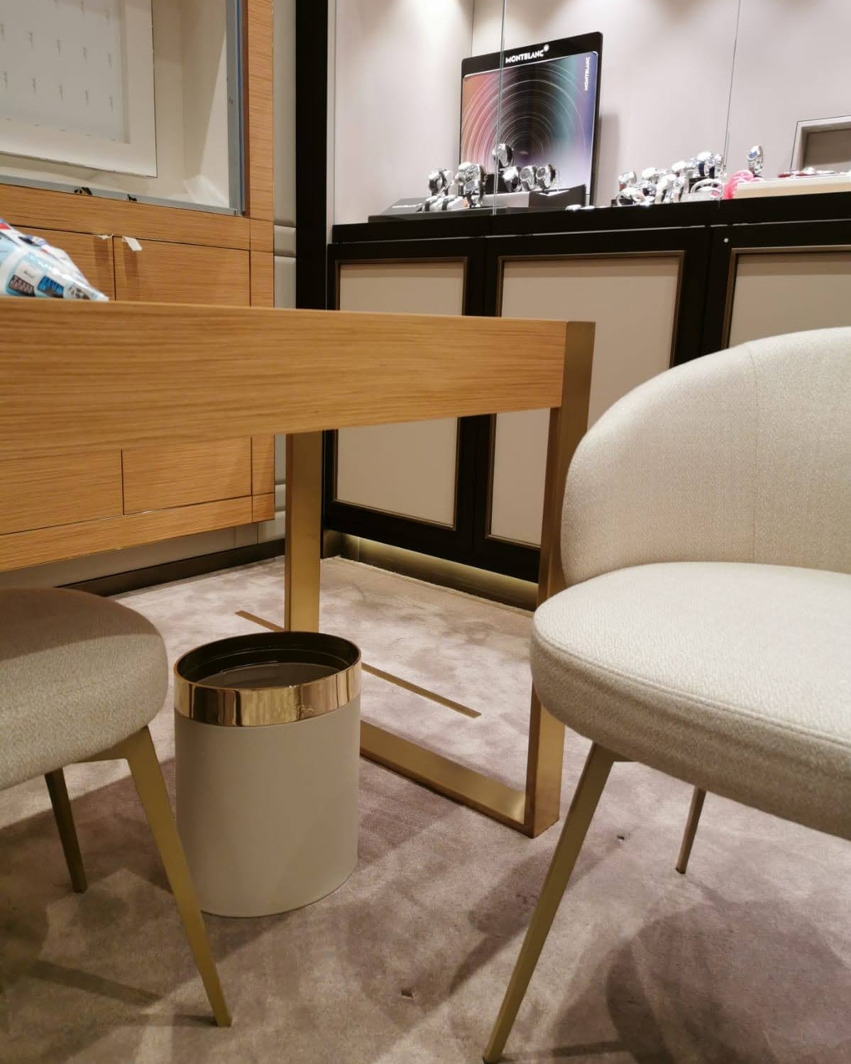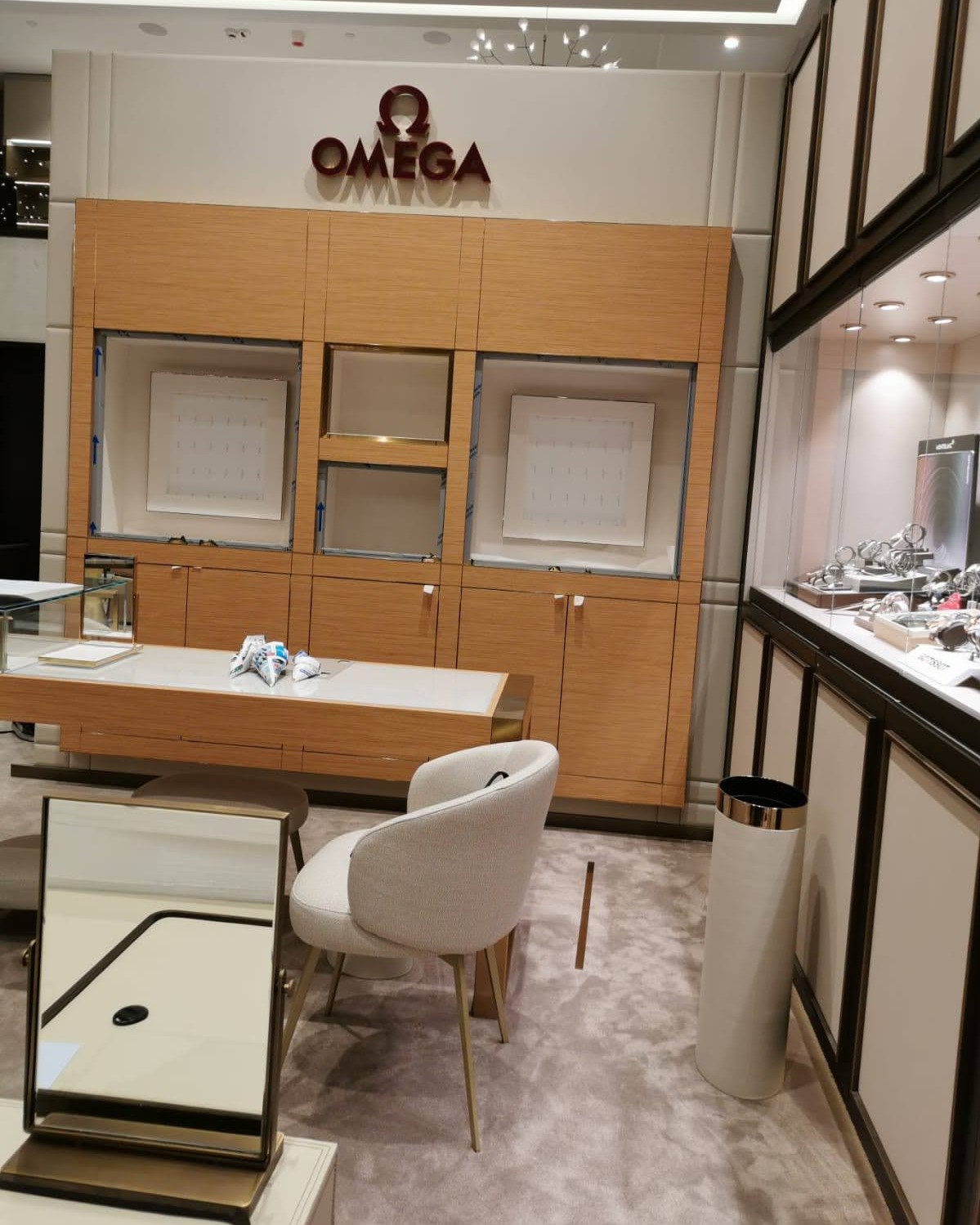 The facade of the store, whose facade covering started with brass tumbled surface joinery, was completed in perfect integrity with consecutive brass tumbled surface cast coffee tables, display units, table top mirrors, cabinet door frames, brand logos, drawer handles, glass display units, and illuminated signs.