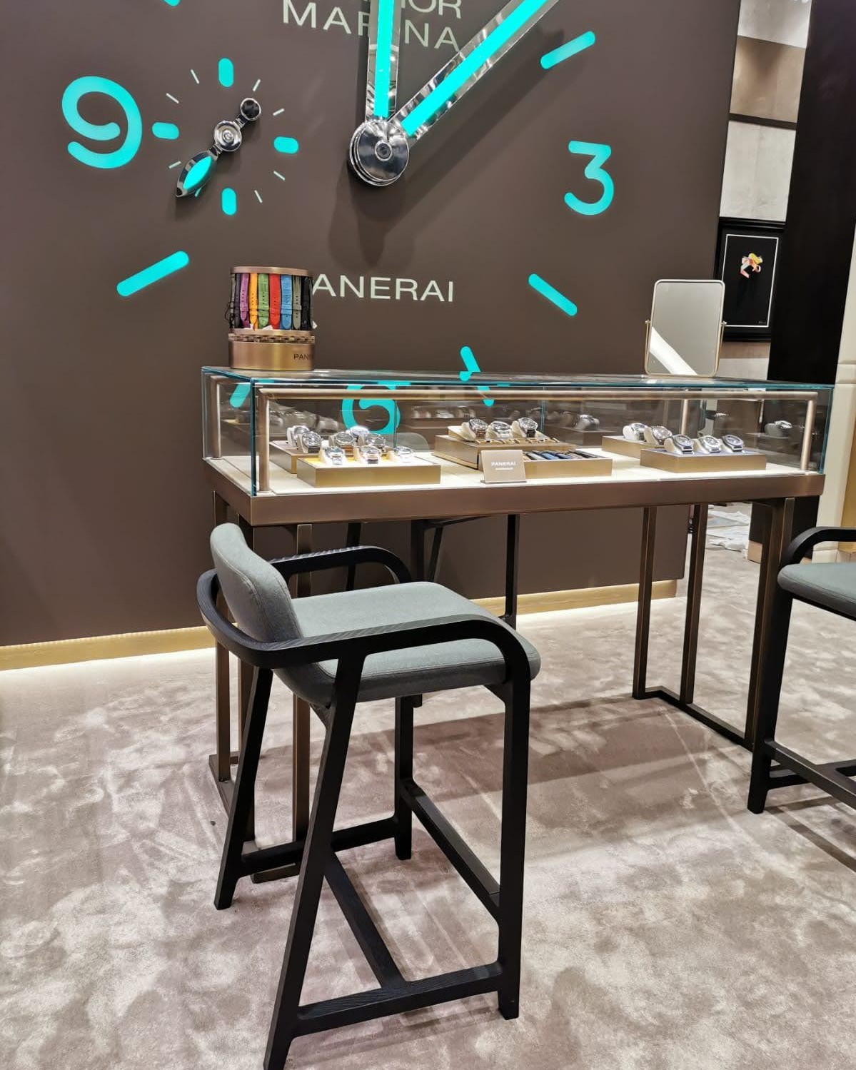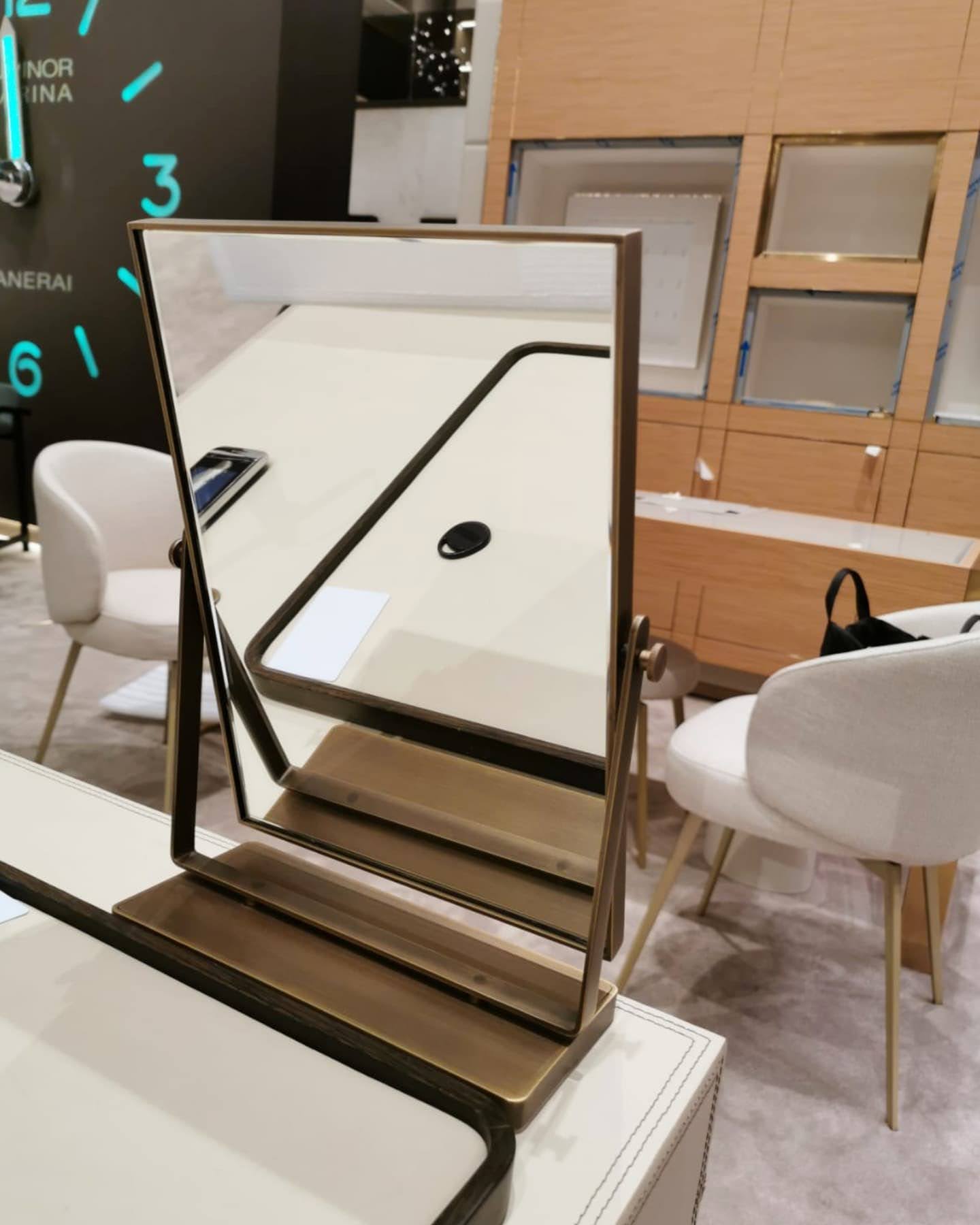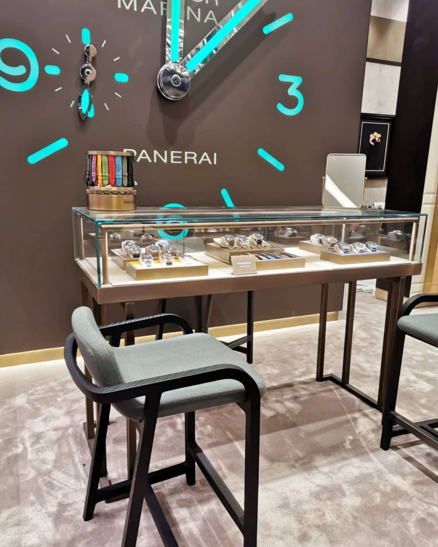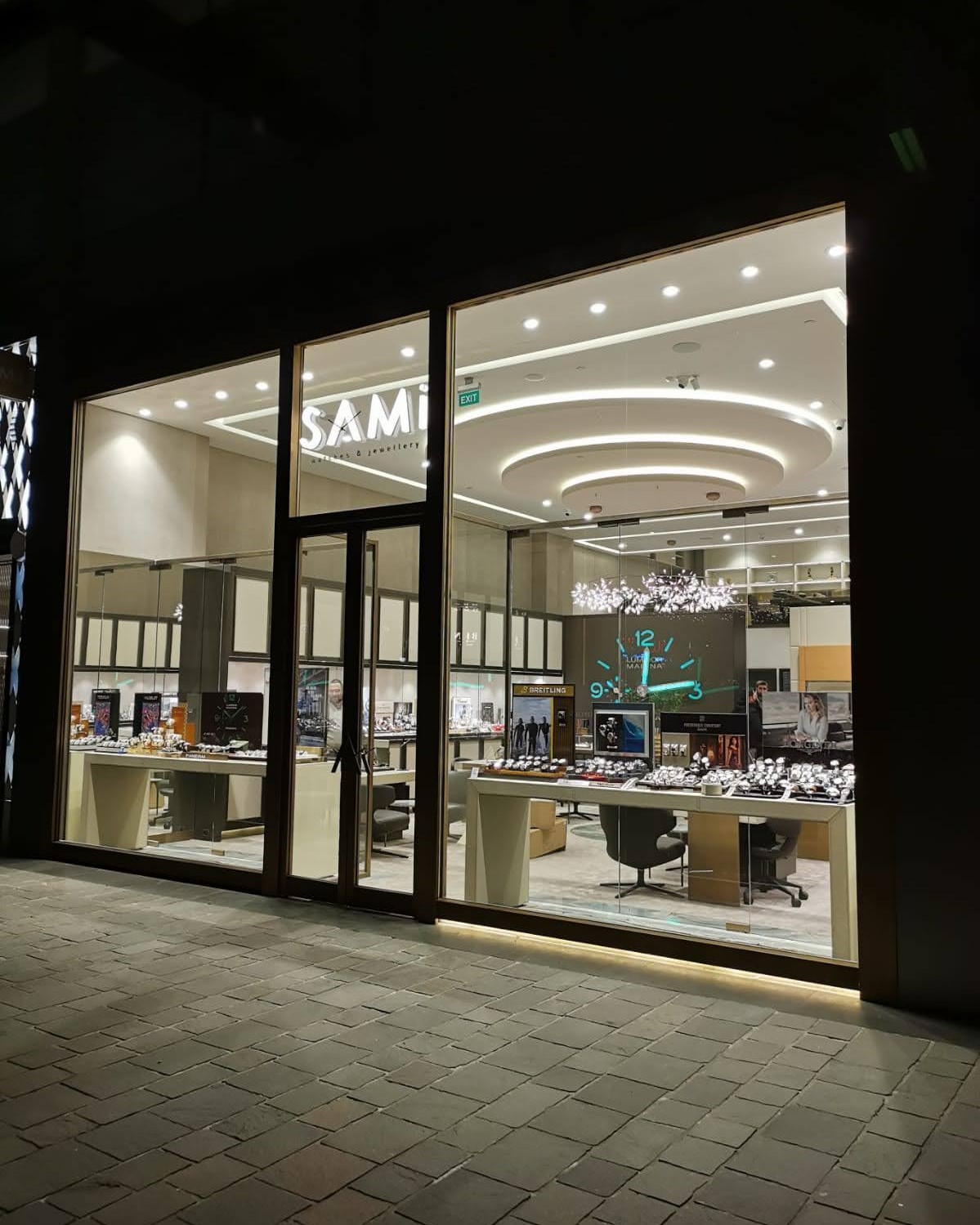 The facade of the store, whose facade covering started with brass tumbled surface joinery, was completed in perfect integrity with consecutive brass tumbled surface cast coffee tables, display units, table top mirrors, cabinet door frames, brand logos, drawer handles, glass display units, and illuminated signs.