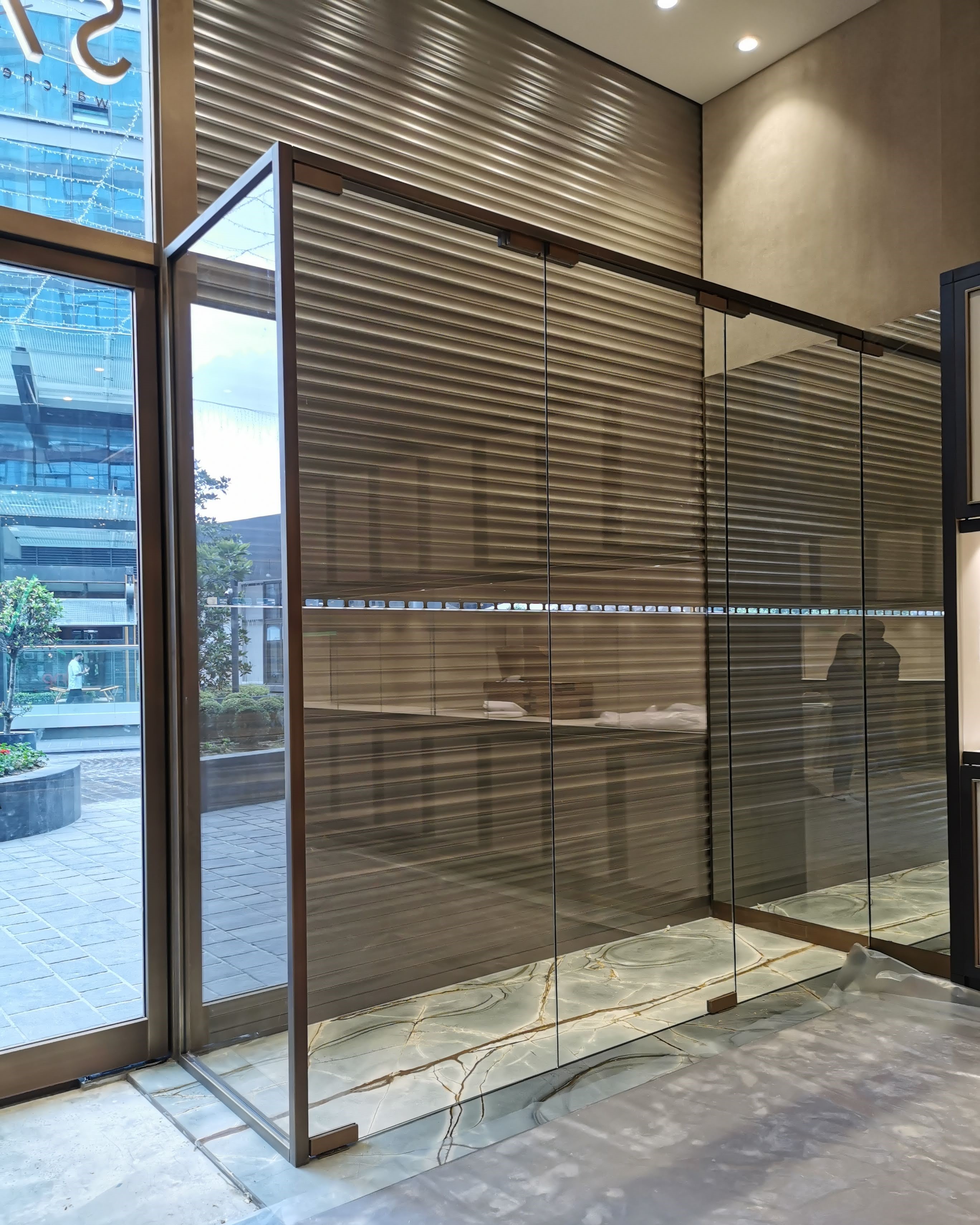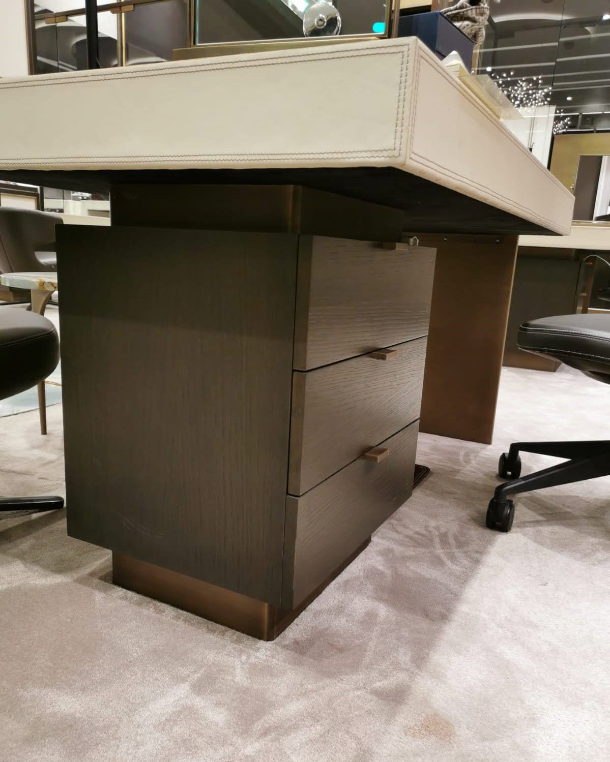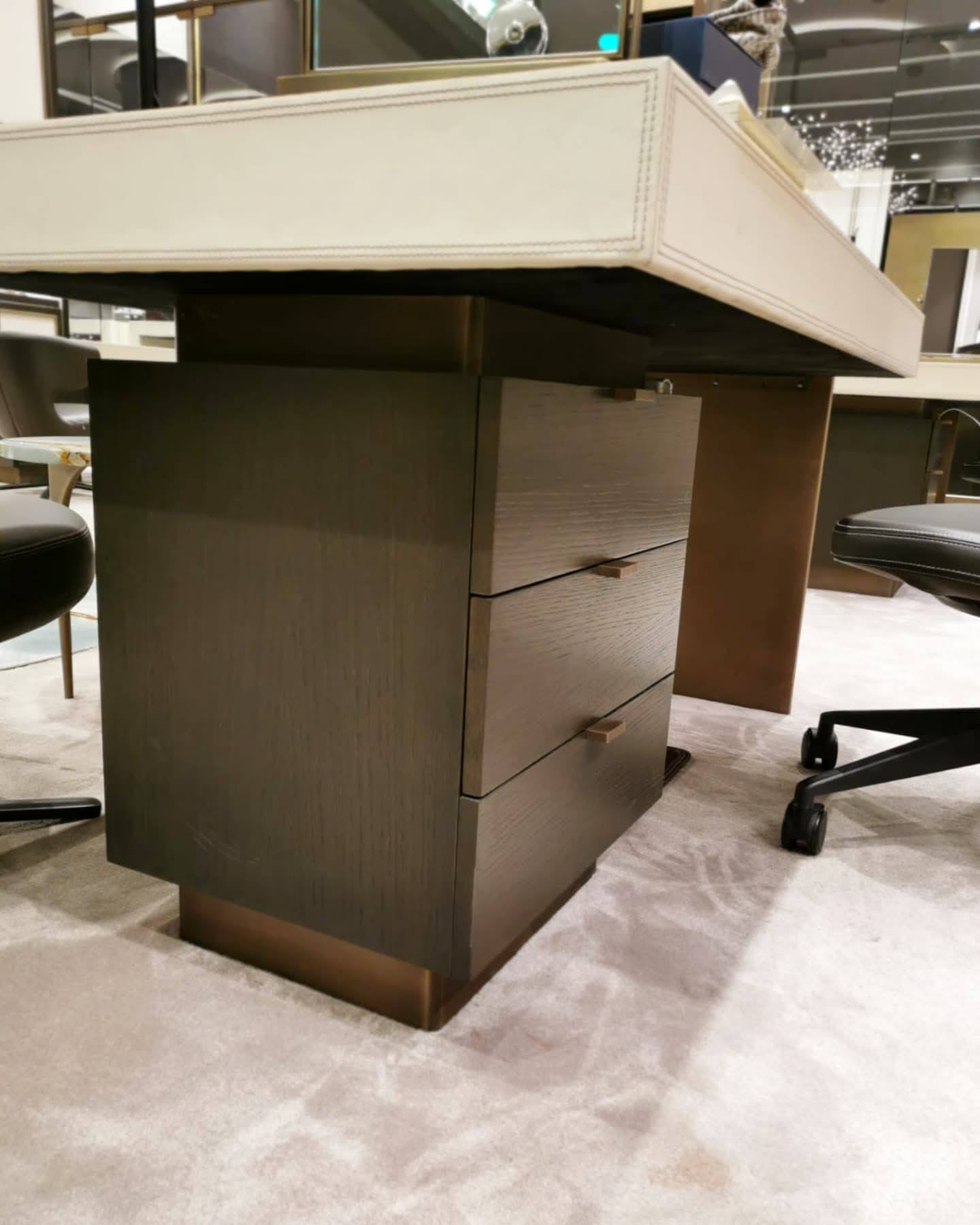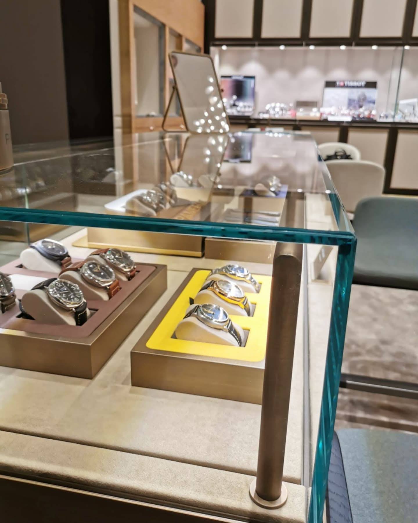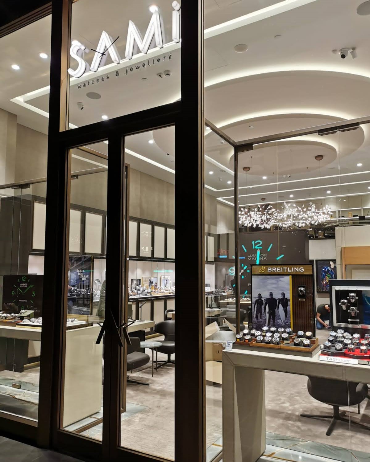 The facade of the store, whose facade covering started with brass tumbled surface joinery, was completed in perfect integrity with consecutive brass tumbled surface cast coffee tables, display units, table top mirrors, cabinet door frames, brand logos, drawer handles, glass display units, and illuminated signs.